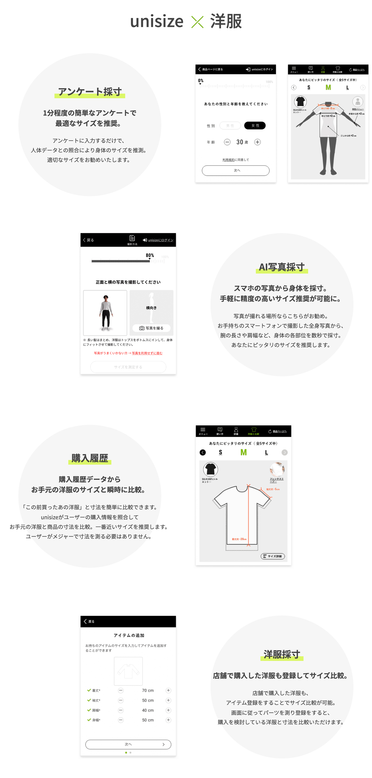 unisize(https://cl.unisize.makip.co.jp/)はネットで洋服を買うときに、より身体に合ったサイズを推奨するレコメンドエンジンです。国内外の洋服ブランドを対象に多量な洋服サイズを有し、入力されたユーザーのお気に入りブランド、サイズ、身体情報、特徴を元に最適なサイズを推定する独自のアルゴリズムでレコメンドを行っております。(※特許取得)EC利用者は身体に合う洋服や身体の特徴など、最短1分の簡単なアンケートに答えるだけで、メジャーで測ることなく自分に合ったおすすめのサイズを確認することができます。