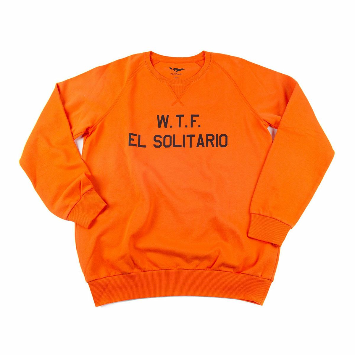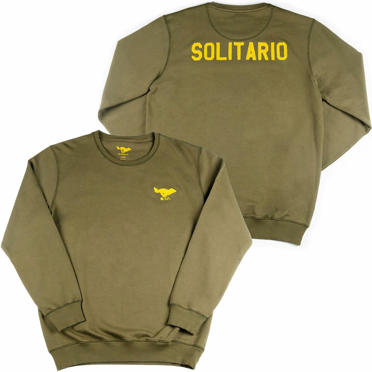 左胸にはブランドアイコンのウルフが、背中には「SOLITARIO」の文字が刺繍されたミディアムウェイトコットンのスウェットシャツです。