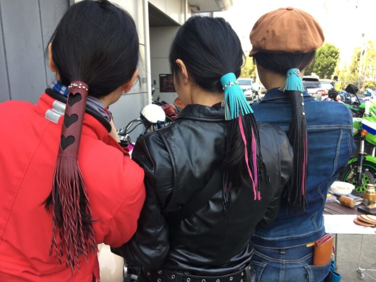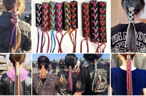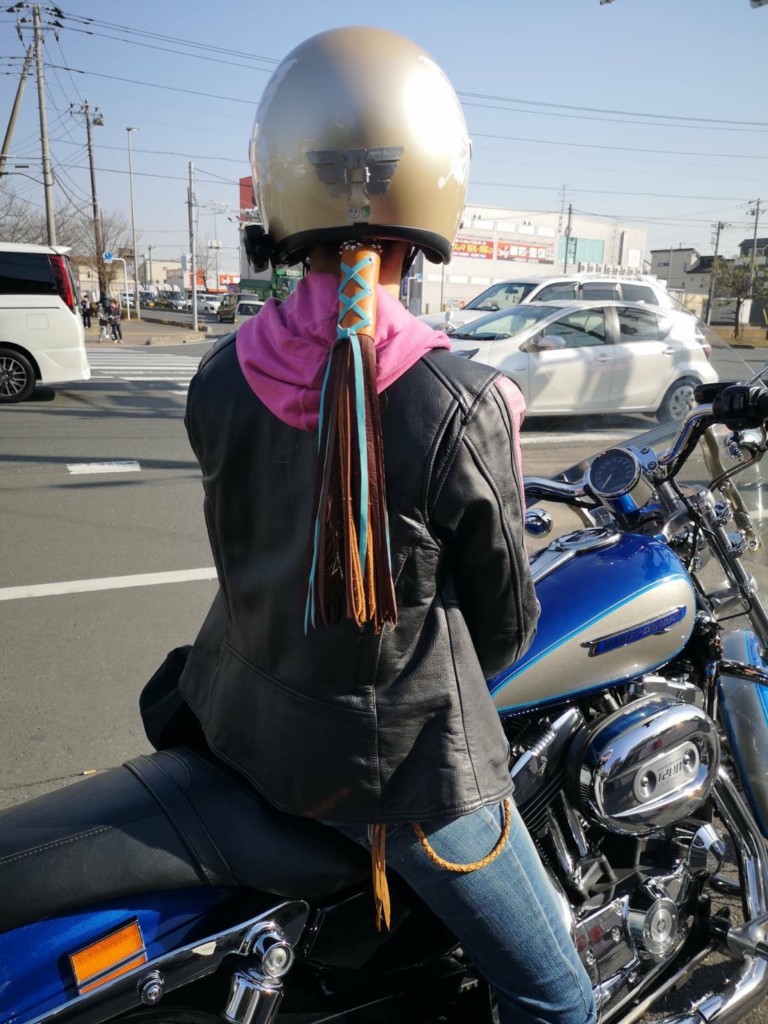 ひとつに結んだ髪を柔らかなレザーでカバーしつつ、リボンやフリンジが付いているのでおしゃれなヘアアクセサリーとしても人気の商品です。デザインもいろいろありますが、これを作っているのはハーレー乗りのnoriさんこと渡邊紀子さん。「アトリエ・ラ・チーカ」というブランドでさまざまレザーアイテムを展開しています。