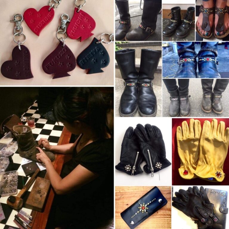 また、レザーアイテムにスタッズを付けて自分だけのオリジナルアイテムに仕上げることもできるので、お手持ちのグローブやブーツなど、スタッズを付けたいアイテムがあれば当日お持ちください(アイテムや箇所によっては打てない場合もあります)。