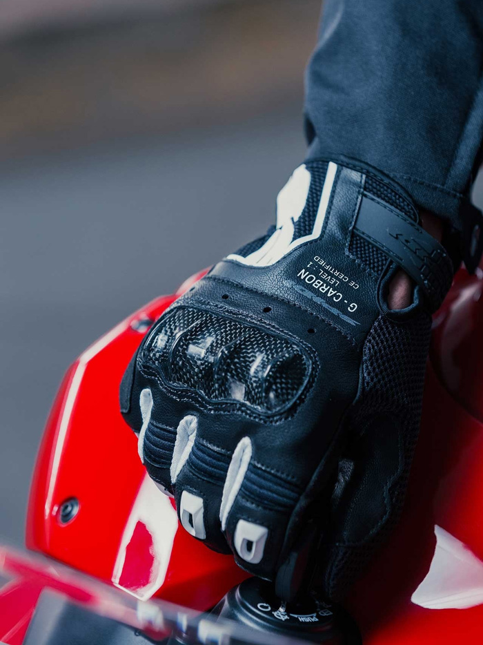このSPIDI G-Carbonグローブは、カーボンナックルガードと磨耗防止のため高度な合成スエードを備えていながらわずか140グラムという軽量化を実現。細やかなスロットルワークやブレーキングを可能とし、疲労の軽減にも寄与しています。
