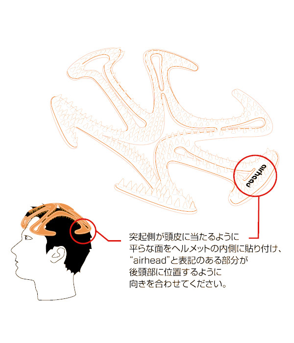 柔らかいシリコンでできたパッドをヘルメットの内側に貼り付け挿入することで、ヘルメットと頭皮の間に物理的な空間を作り出し、ヘルメット内部に空気の流れを生みだします。これによりヘルメット内部の湿気、汗、そして髪がつぶれてしまうことを軽減します。また、医療用レベルのシリコンを用い、静電気防止、抗菌、アレルギー対策加工を施しております。 ユニークな形状はどのようなヘルメットの内側にもぴったりフィットするように工夫された形です。ヘルメット内部が若干大きいと感じた際のサイズ調整としてもご使用いただけます。