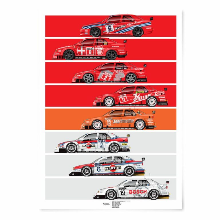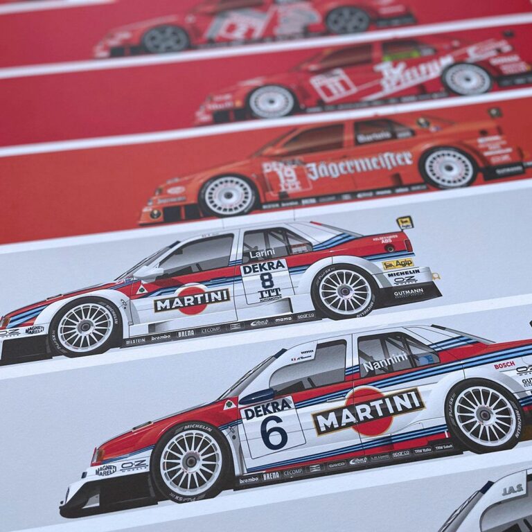 ポスターには、DTM・ITCで活躍した車両以外にも、155 V6 TIの前身となる155 GTAも描かれていることから、アルフィスタの心を掴むような作品に仕上がっています。
