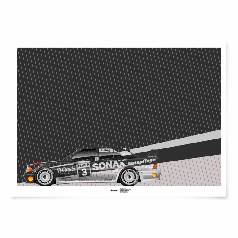1992年シーズンのDTM(ドイツ・ツーリングカー・選手権)を制した、クラウス・ルートヴィッヒのメルセデス ベンツ 190E 2.5-16 Evo2のポスター。メインスポンサーとしてボディデザインにもあしらわれてる、ヒューゴ・ボスのストライプ柄を強調したデザインポスターに仕上げられています。