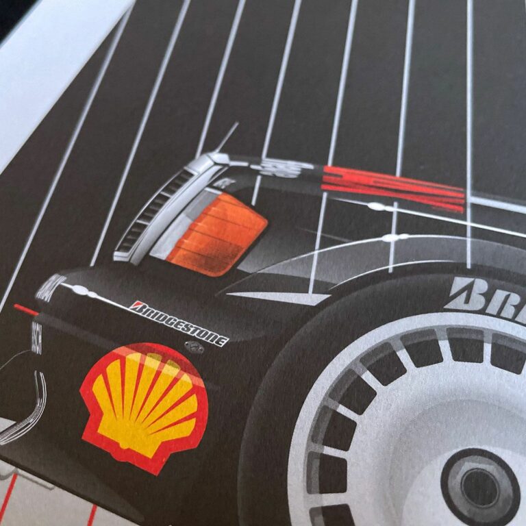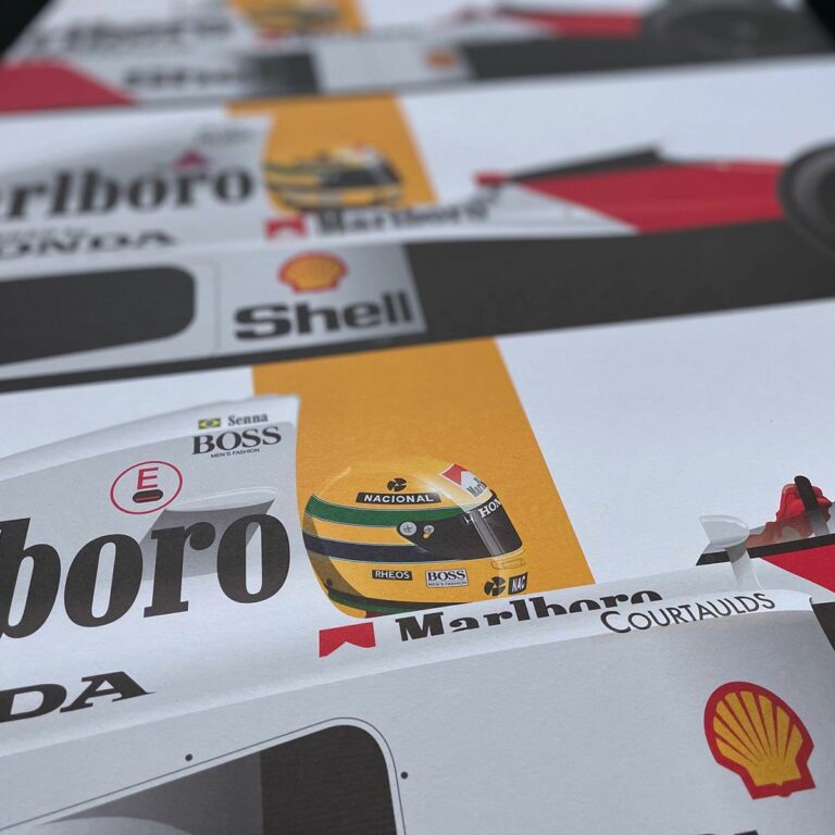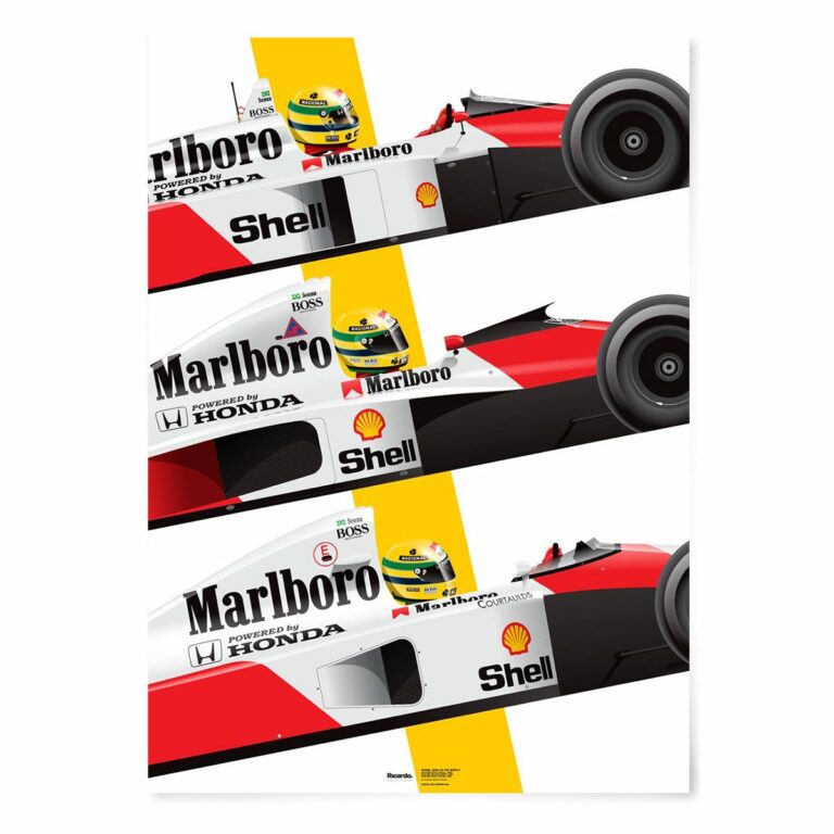セナによる3度のF1ワールドチャンピオンは、いずれもマクラーレン・ホンダによるもので、全て鈴鹿でタイトルを決めていました。マクラーレン MP4/4(1988), MP4/5B(1990), MP4/6(1991)のサイドビューと、セナのシートポジションやステアリングを切りながら右に頭を傾けている様子がリアルなタッチで表現されています。