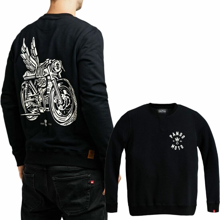 胸元にPANDO MOTOのロゴがあしらわれており、バックプリントには羽がついたカフェレーサーのイラストがあしらわれています。