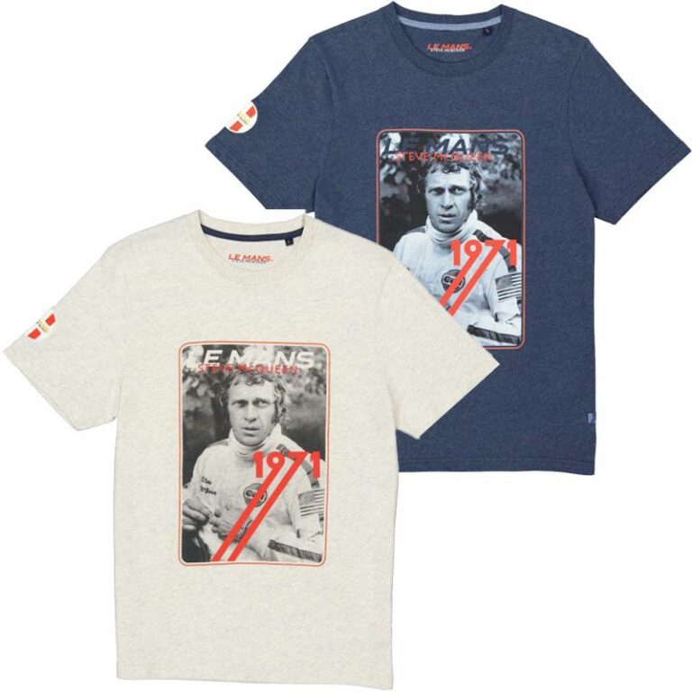 映画「栄光のル・マン」でマックィーン演じるディレイニーが着用していたレーシングスーツのカラーをモチーフにしたレーシングストライプや、チェッカーを受けた際のゼッケン20などがあしらわれたTシャツ。