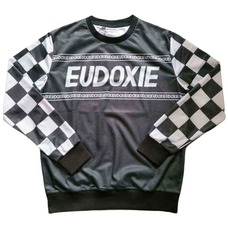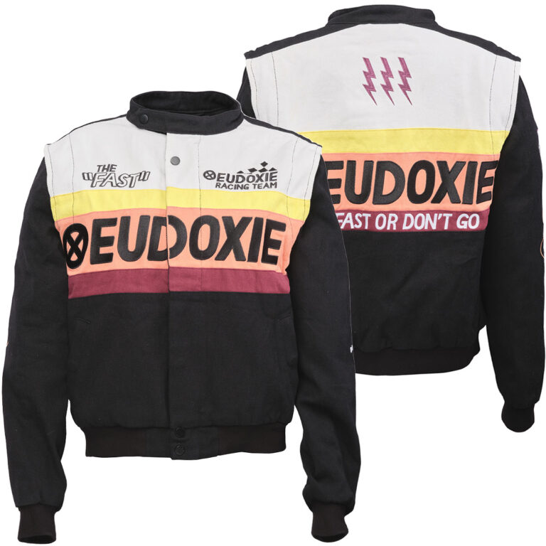 左胸にEUDOXIEオリジナルのワンポイントロゴがあしらわれており、ゴーグルとピークを装着したジェットヘルメットの正面から、満開のお花が咲き開いた女性らしさを表現した特徴的なデザインが大きくバックプリントされています。