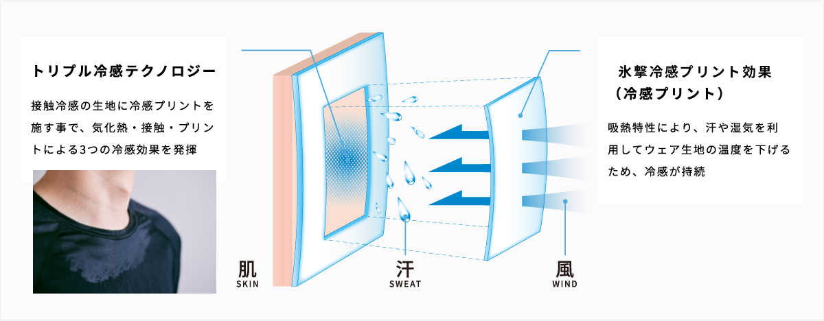このプリント処理した生地が、人の皮膚から発生する水分(汗)を吸収すると、その吸熱特性により生地温度が下がり、冷感を付与。