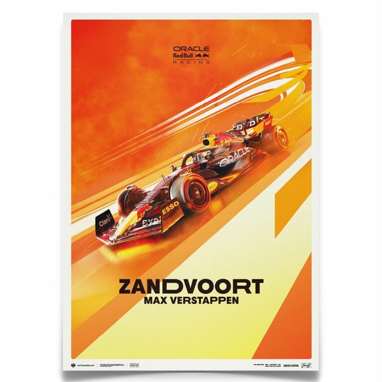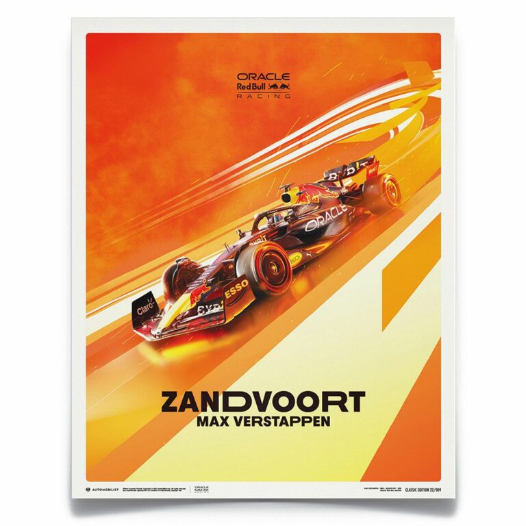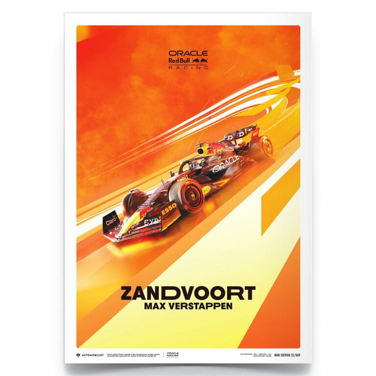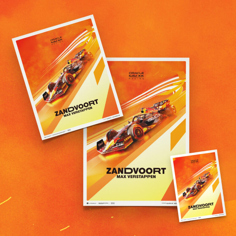 観客席からモクモクとしたオレンジの発煙筒が焚かれるオランダGPさながらの光景をもとに、最終コーナーからホームストレートに向かって煙幕を切り裂きながら駆け抜けていくマックスの様子がグラフィカルなタッチで描かれています。今回のポスターでは、通常のリミテッド エディション(70×50cm)に加え、クラシック(50×40cm)とミニ(21×30cm)が新たに追加、デザインは3種とも同じですが、リミテッド エディションのみ、世界限定1000枚となります。母国での勝利、2年連続のワールドチャンピオンに向けてひた走る、マックス・フェルスタッペン ファン必見のポスターです。