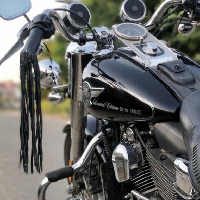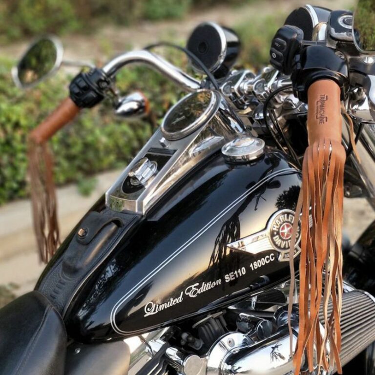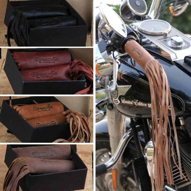 バッファローレザーのフリンジがついた、チョッパー向けのハンドルグリップカバー。グリップ部分にTRIP MACHINEのブランドロゴが刻まれています。取付けは、ハンドルグリップの上に被せて、革の紐をシューレースのように結んで使用します。カラーはブラック、チェリーレッド、ヴィンテージタン、タバコブラウンの4色展開。ドレスアップ効果だけでなく、ヒラヒラと風にたなびかせながら、駆け抜ける爽快感を味わってみるのもよいでしょう。