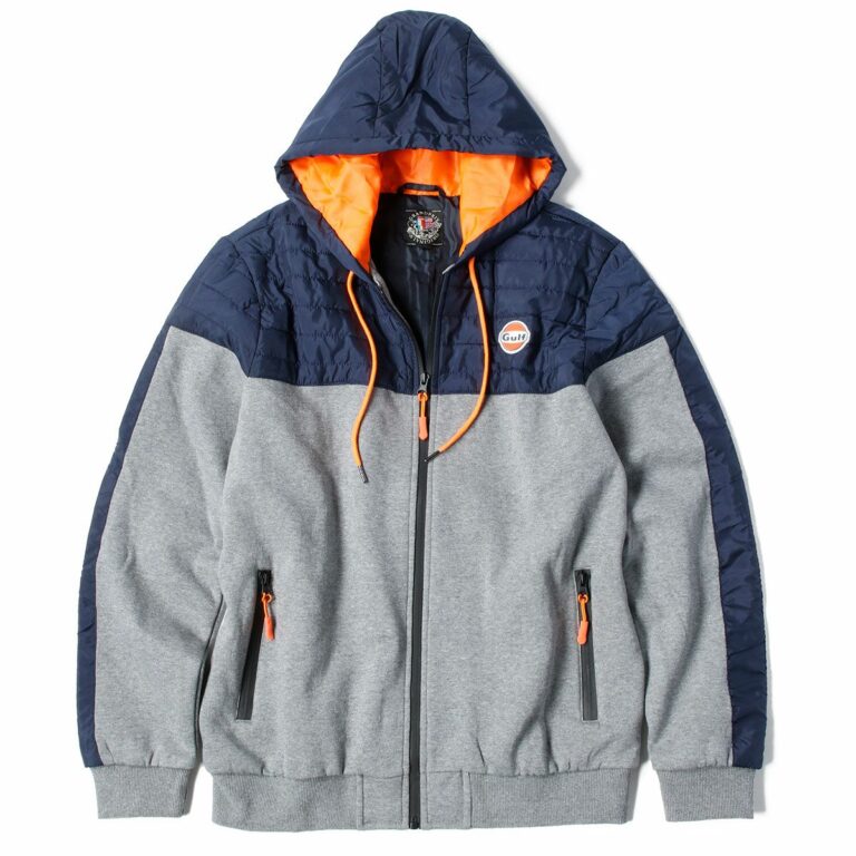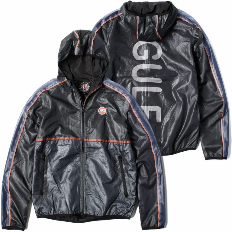 薄手の素材を使用しており、肩から袖にあしらわれたネイビーのラインとフードを除いたウエア全体にシースルーの生地が使用されたオリジナルなデザイン。背中のGULFの文字も内側にプリントされています。