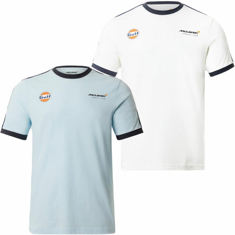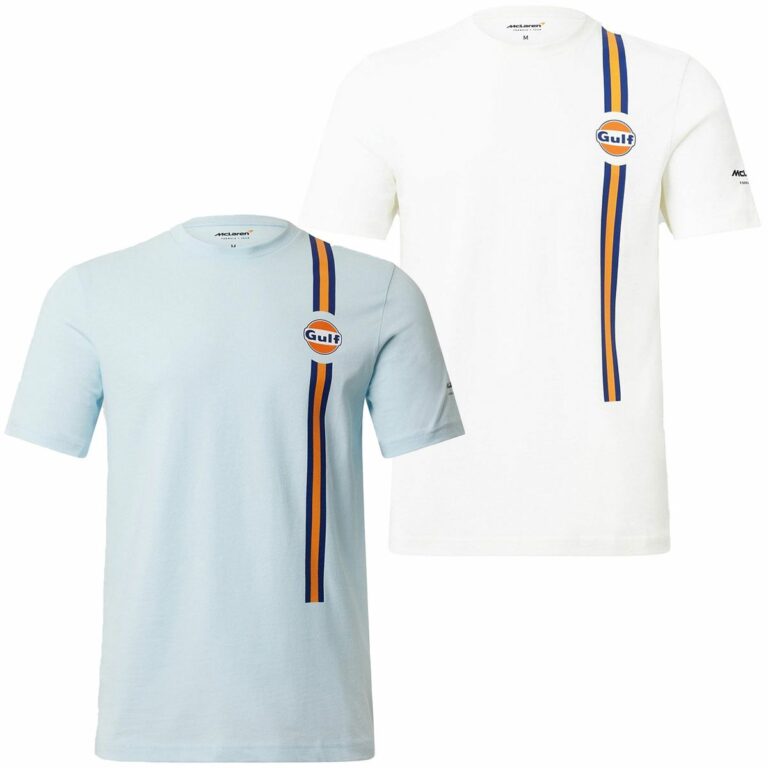 左右の胸元にマクラーレンとガルフのロゴがそれぞれプリントされたシンプルなデザイン。肩から袖にかけてあしらわれたストライプが印象的な半袖Tシャツ。