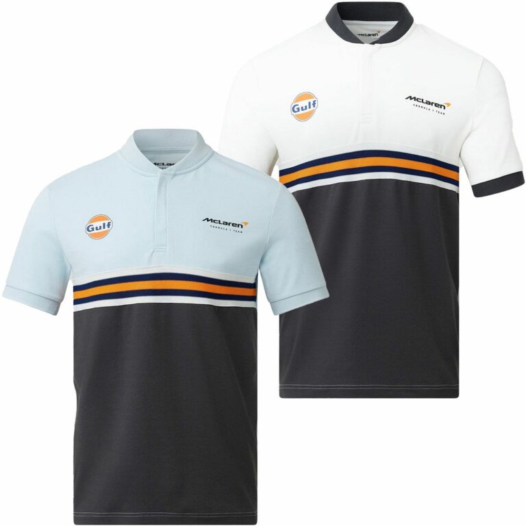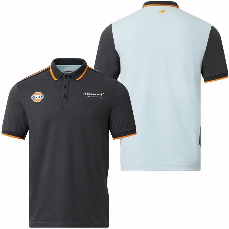 上下に色分けされたツートンカラーで、左右の胸元にマクラーレンとガルフのロゴがそれぞれあしらわれており、その下に刻まれたストライプと襟部分が特徴的なポロシャツです。