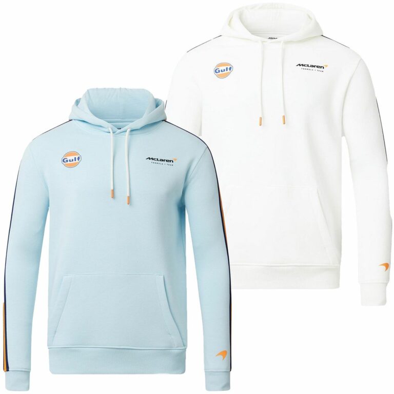 左右の胸元にマクラーレンとガルフのロゴがそれぞれプリントされたシンプルなデザイン。肩から袖にかけてあしらわれたストライプが印象的なフー度パーカー。