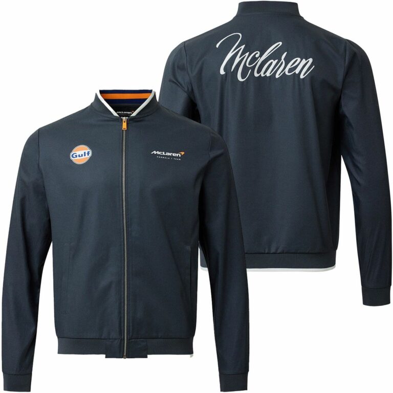 左右の胸元にマクラーレンとガルフのロゴがそれぞれプリントされたシンプルなデザイン。背中に大きくあしらわれたマクラーレンのロゴが印象的なボンバージャケット。