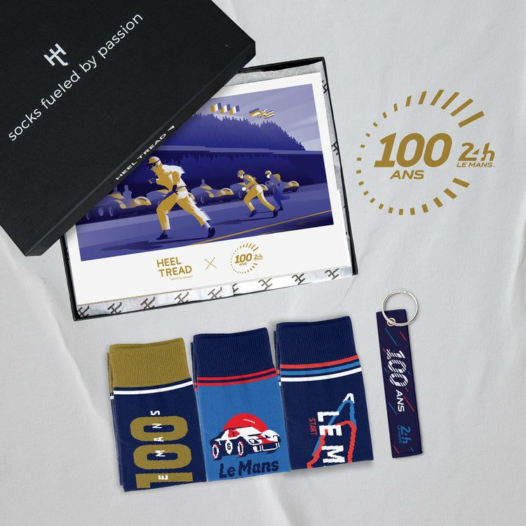 "MILLE NEUF CENT VINGT TROIS"は、フランス語で"1923"を表しており、ル・マン サルテサーキットのコース図や、1960年代後半に活躍したフォード GT40のシルエットなどがあしらわれたソックス3点と、キーホルダー1点が付属されたセットになります。ル・マン24時間レース公認アイテム。