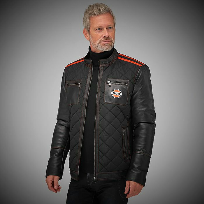前見頃と後ろ身にキルティング素材のナイロン、袖にラムスキンの袖がそれぞれあしらわれたナイロンレザージャケット。ショルダー部分にあしらわれたオレンジのレーシングストライプや胸元のポケットでガルフらしさを演出しています。