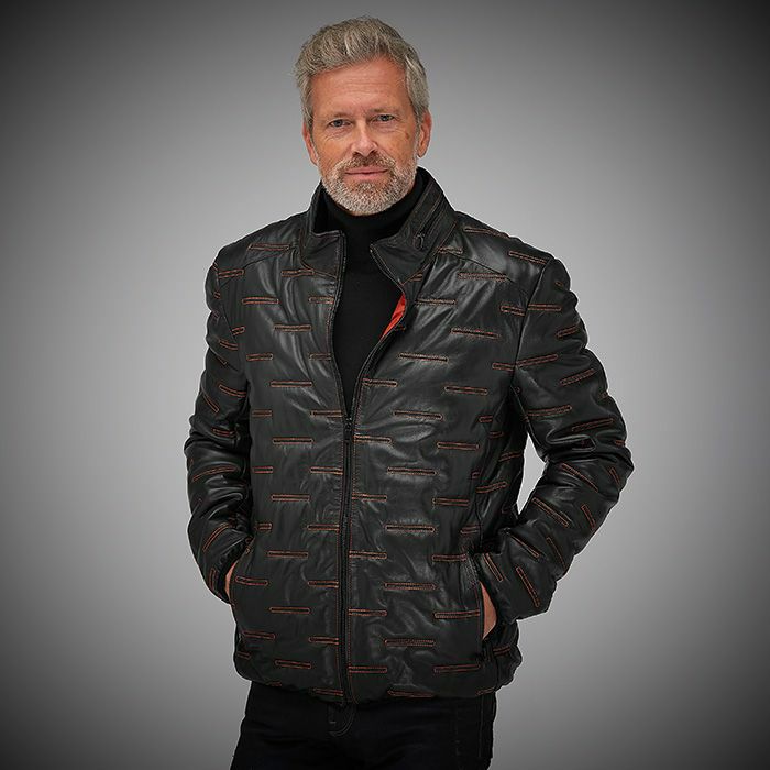 ジャケット全体にあしらわれたオレンジ色のステッチラインが特徴的。スタイリッシュさを重視し、職人の手によって、ひとつひとつ手作業で行われています。襟部分のジッパーはアクセントとされており、簡易フードなどは収納されておりません。