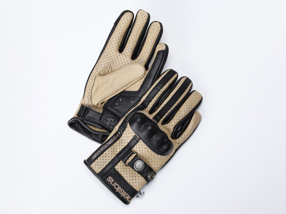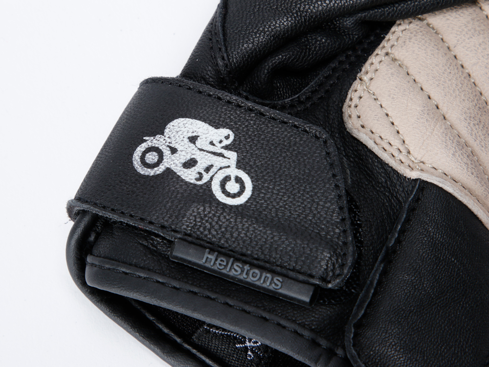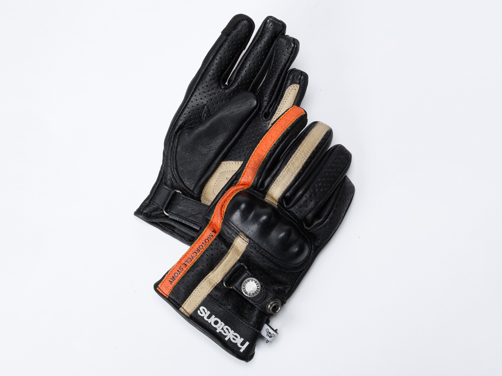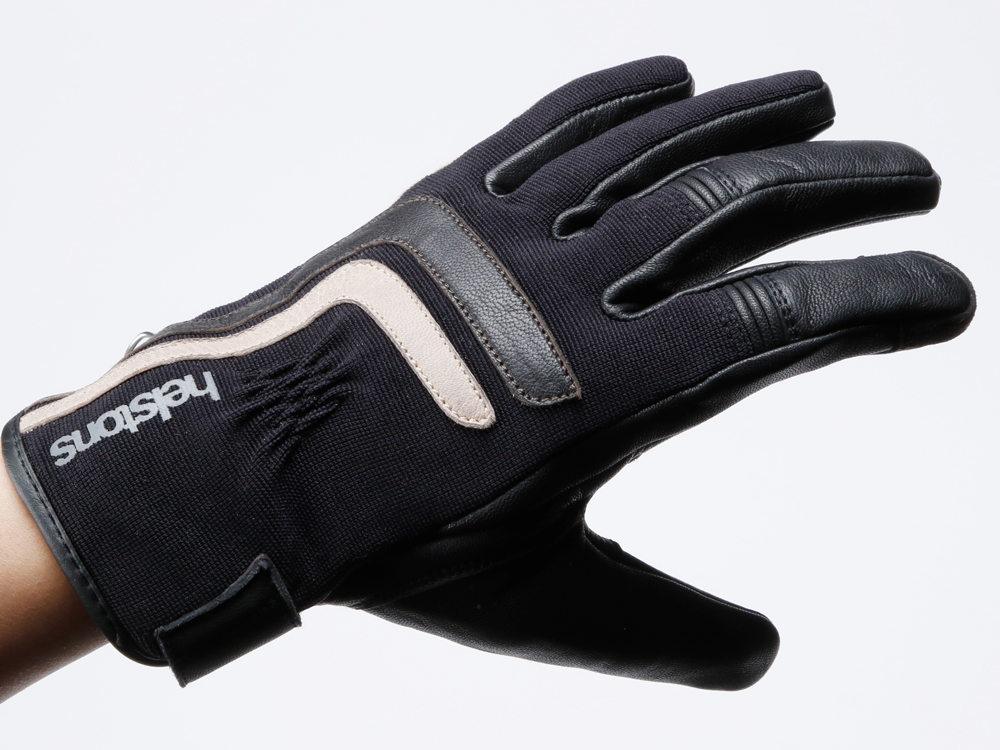 ファブリックとレザーを組み合わせたヘルストングローブ23SSモデル。スマホ対応。手首部はベルクロでしっかり固定できます。