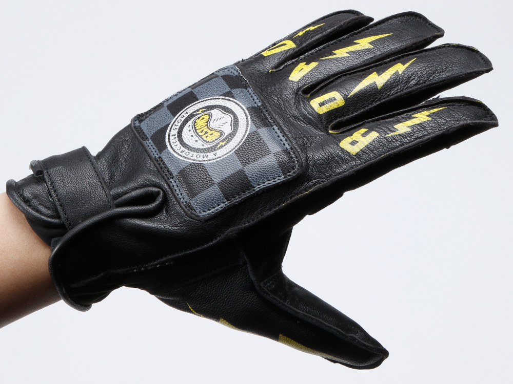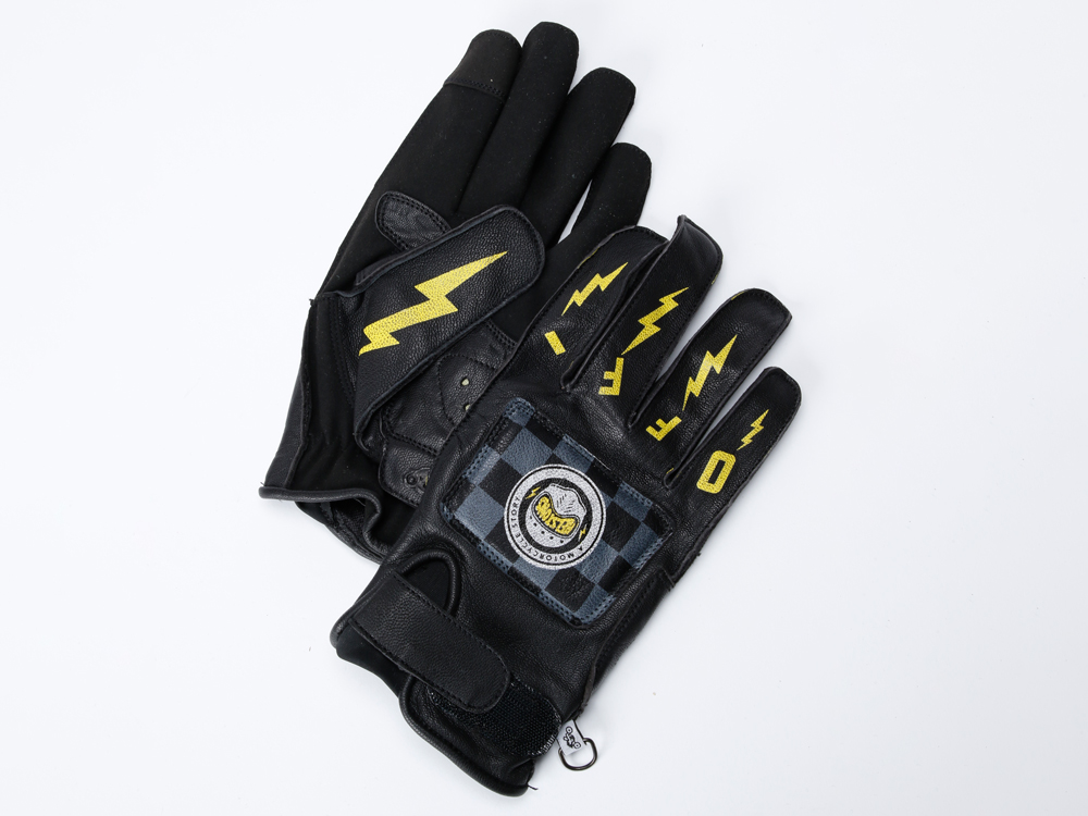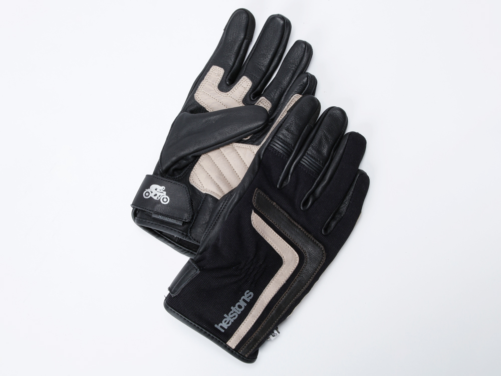 ファブリックとレザーを組み合わせたヘルストングローブ23SSモデル。スマホ対応。手の甲にはアイコニックなロゴがプリントされています。