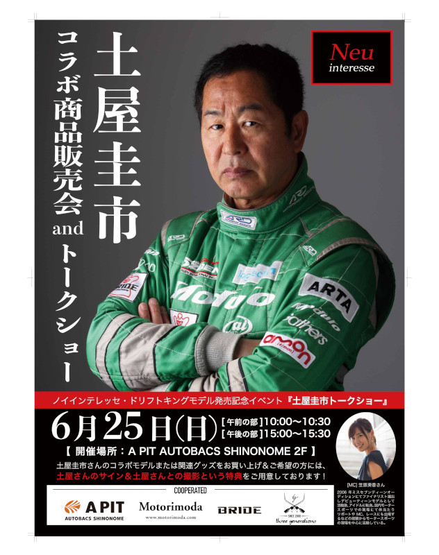 "ドリフトキング"こと、土屋圭市氏とノイインテレッセとのコラボレーションシリーズによる、DRIFTKING モデルの予約受付を開始致します。土屋氏のオフィシャルオンラインショップでは、予約受付の段階で一部完売状態になっている人気アイテムをモトーリモーダのオンラインショップでも販売させていただけることになりました。