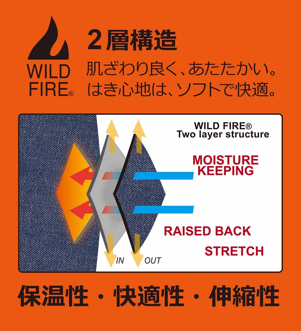 「ワイルドファイア」の温かさの秘密は、2層構造の生地にあります。保温力は主に裏地によって提供され、柔らかな起毛素材が体温で温められた空気をキープし、長時間の保温を実現します。起毛面は肌触りが柔らかで、快適さを提供し、ストレスを感じさせません。さらに、ストレッチ性に富んだツイル素材を表地に採用しており、動きに適応して伸縮し、細身のパンツにありがちな窮屈さを回避します。この保温性のある裏地は外部の寒さから足を守り、動作に制約を与えません。しっかりと暖かく、快適な履き心地を提供する「ワイルドファイア」。この二つの要素を組み合わせが、人気の秘密となっています。