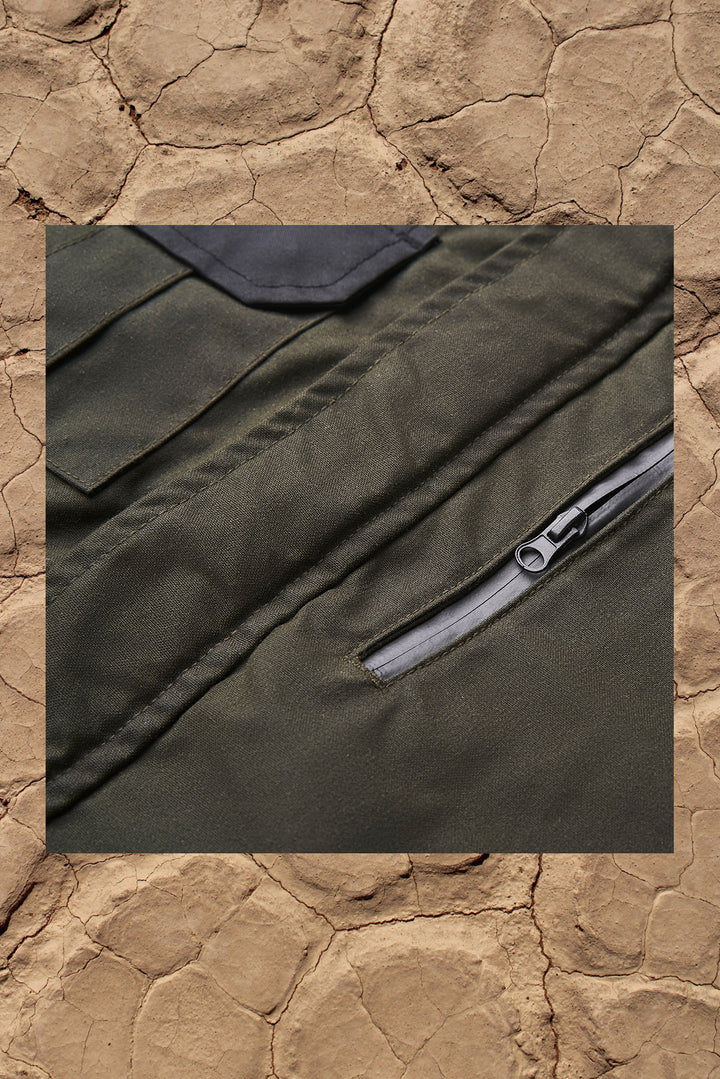 表地には特別なワックス加工を施したキャンバス生地を採用。裏地との間には防水メンブレンを配することにより、雨天時にも最適なジャケットとなっています。