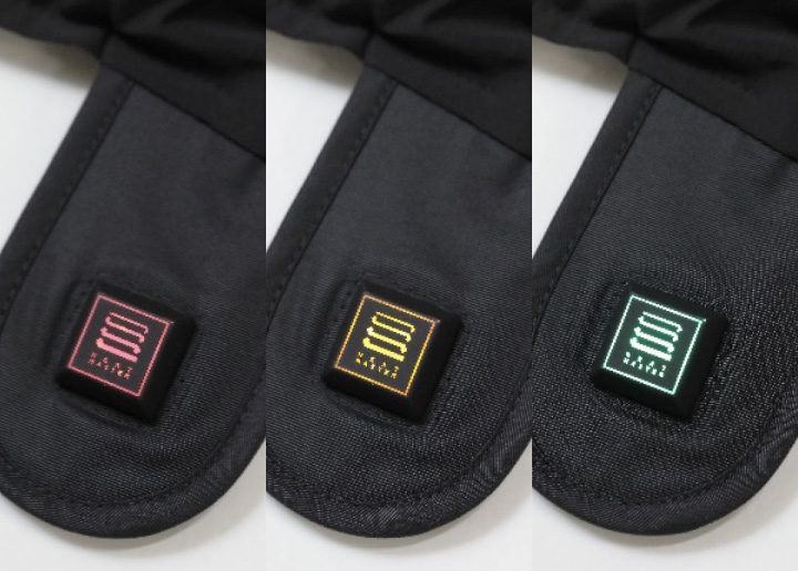 電源スイッチを押すごとにレッド(強)、オレンジ(中)、グリーン(弱)とカラーが変わり、環境に合わせて温度調整ができる(ジャケットはワイヤレスリモコンでも操作可)。