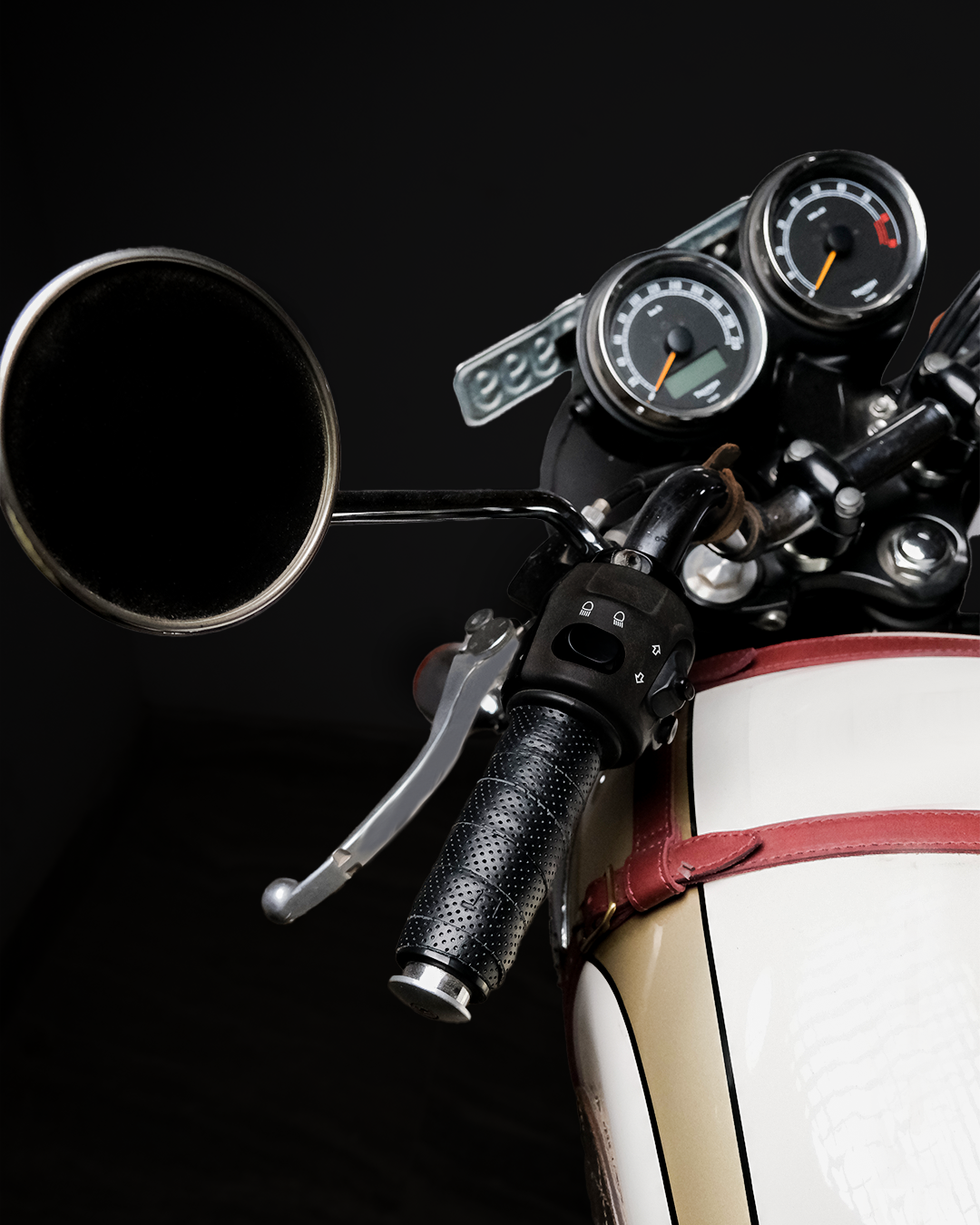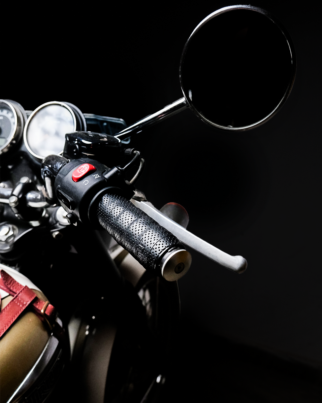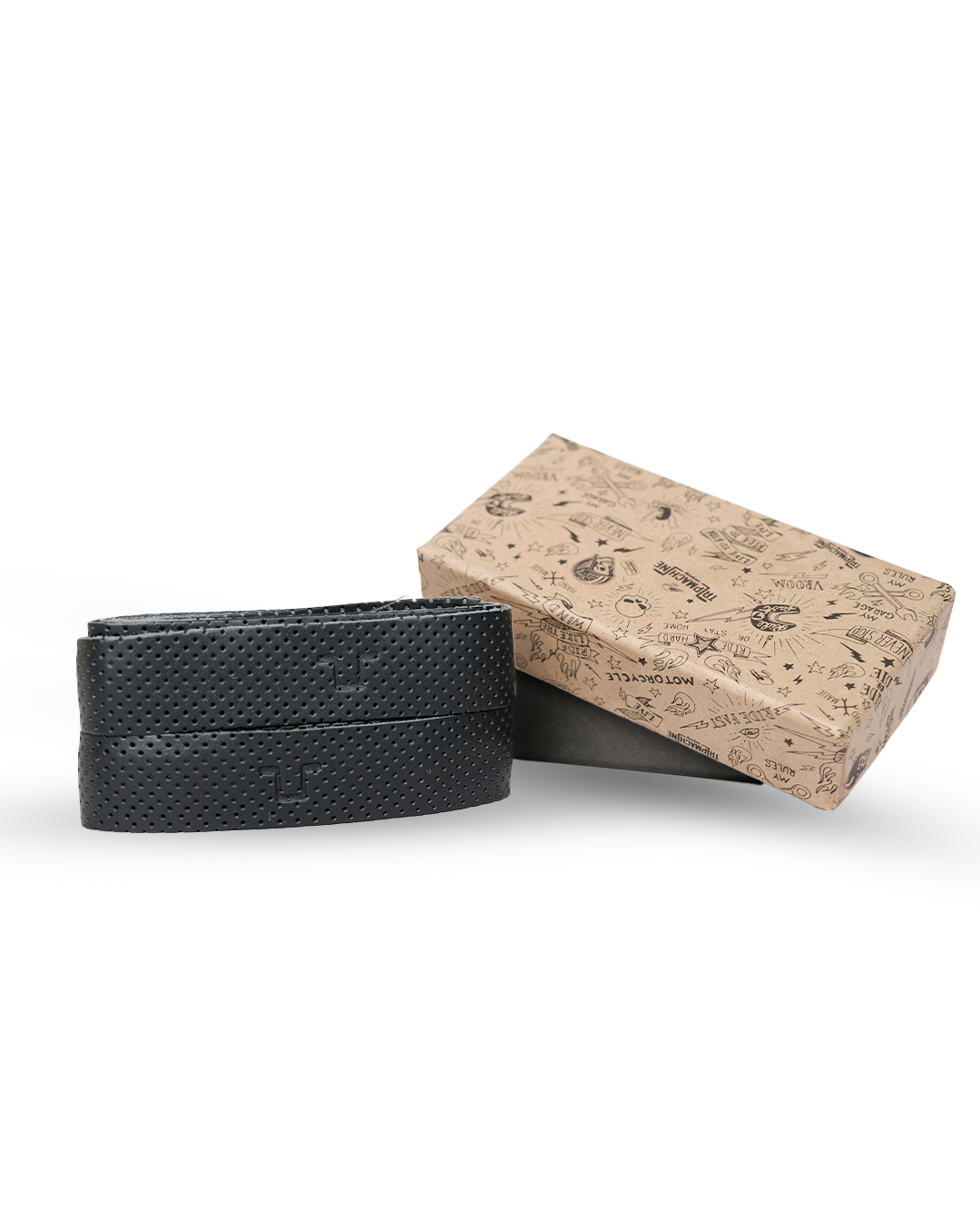 独特なレザーの風合いと色使いにより人気を博しているトリップマシンのベストセラー「グリップラップ」にパンチング仕様が新たに登場しました。より滑りにくくなっていることと、何よりこれまでとはまた違ったテイストのヴィンテージ感が醸し出されています。カラーリングは定番のブラックと、渋さの光るタバコブラウンの2色をご用意。ぜひ愛車に合わせてコーディネートしてください。