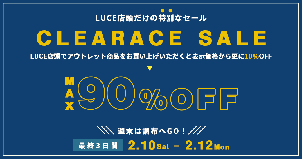 オンラインストアでアウトレット価格となっている商品が、LUCE店頭でお買い物いただくと更に10%オフ!LUCE店限定の大変お得なクリアランスセールは2月12日(月)まで開催しております。