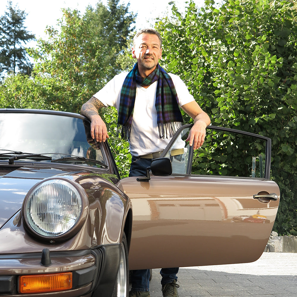 千鳥格子やタータンチェックといった柄を用いるだけでなく、レザーのスリーブ、自動車のパーツにも用いられるエラストマー樹脂(TPE)の蓋を採用したタンブラー形状のポーセリン(磁器)カップは、クルマやコーヒーにこだわりのある方にオススメしたいアイテム。また、モンゴルの小さなファクトリーで作られている希少なウールを使用したスカーフは、オリジナルのタータンチェック柄を再現するため、ドイツで最終工程が行われている徹底ぶりは、まさに職人気質なゲルマン魂に通ずるアイデンティティを感じさせてくれる非常にホットなアイテムだと言えるのではないのでしょうか。