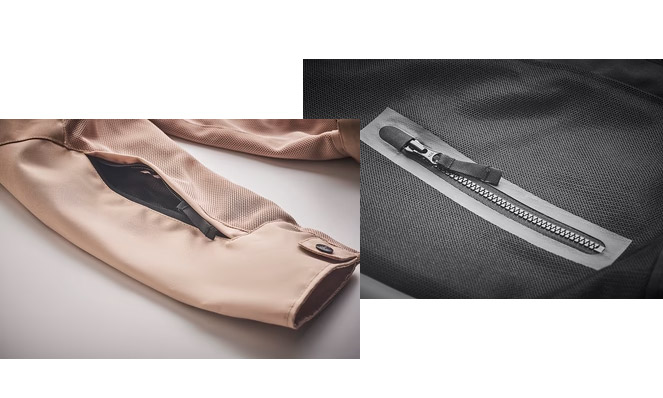 - 肩、肘、背中にCEレベル1のプロテクターを標準装備。