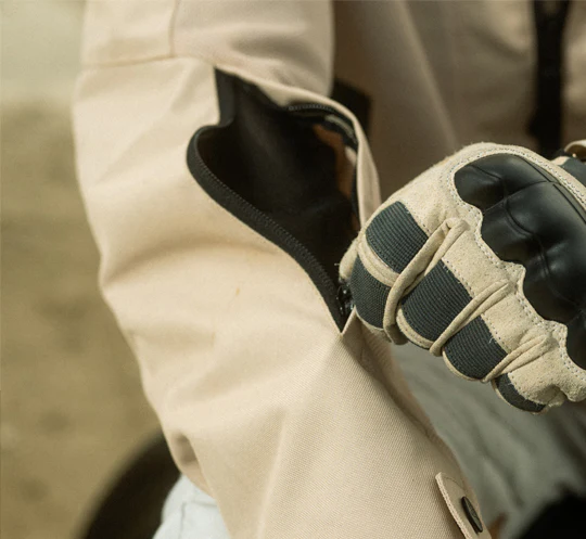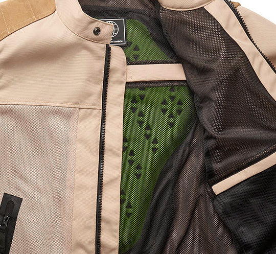 洗練されたパンチングファブリックを採用し、耐久性を損なうことなく優れた通気性を実現しました。CEレベル1の認定を受けたプロテクターが背中、肩、肘に標準で装備され、安全性を重視した設計。