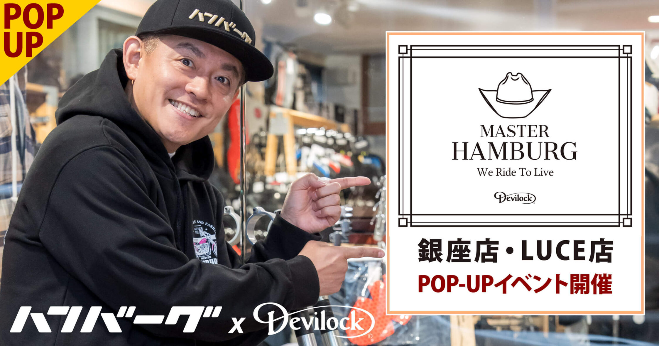 バイク乗りであり、人気お笑いタレントとして、さまざまなフィールドで活躍するハンバーグ師匠こと井戸田潤氏。実はファッションセンスも抜群で、1996年に誕生した恵比寿系ブランドの元祖「DEVILOCK(デヴィロック)」とのコラボレーショングッズを展開しています。