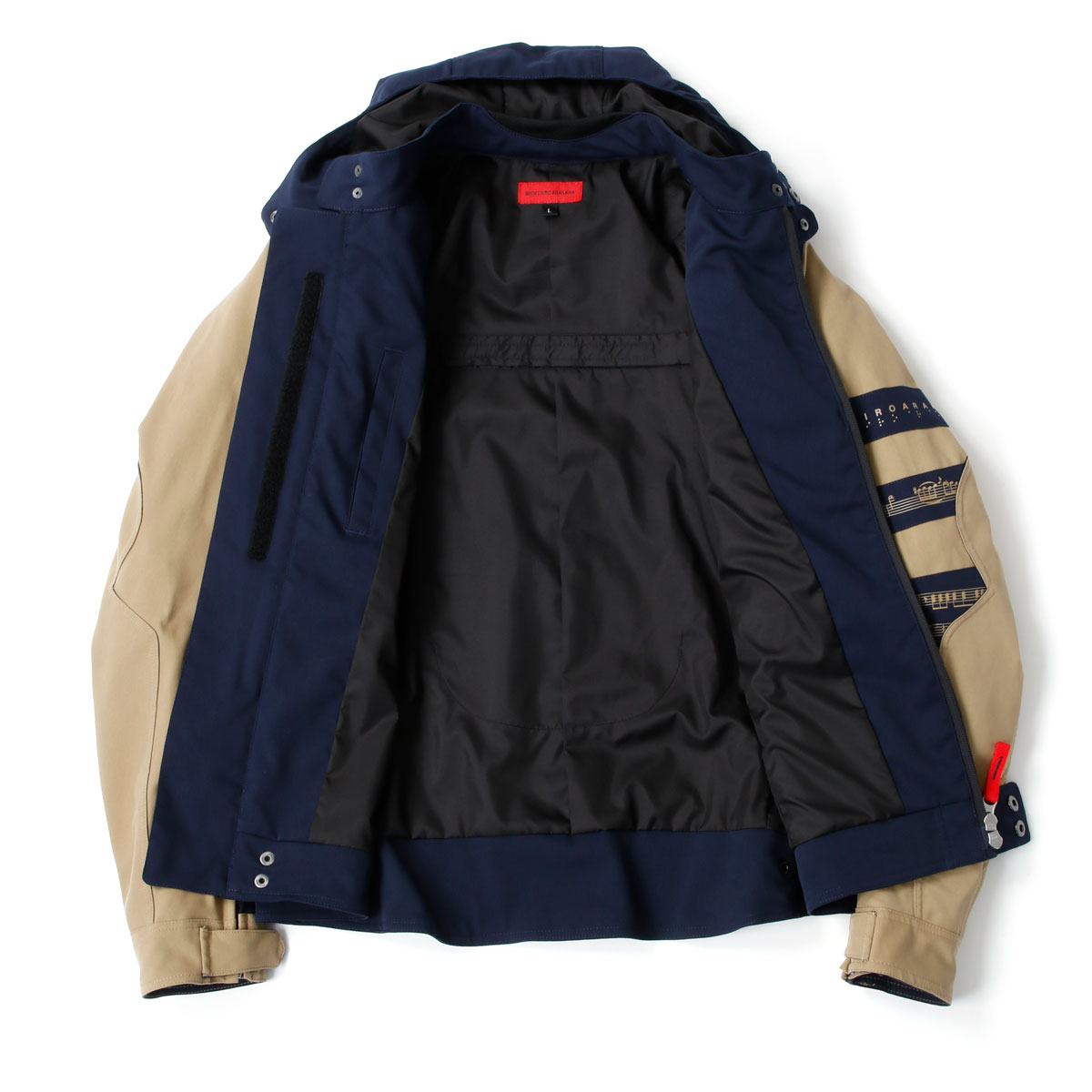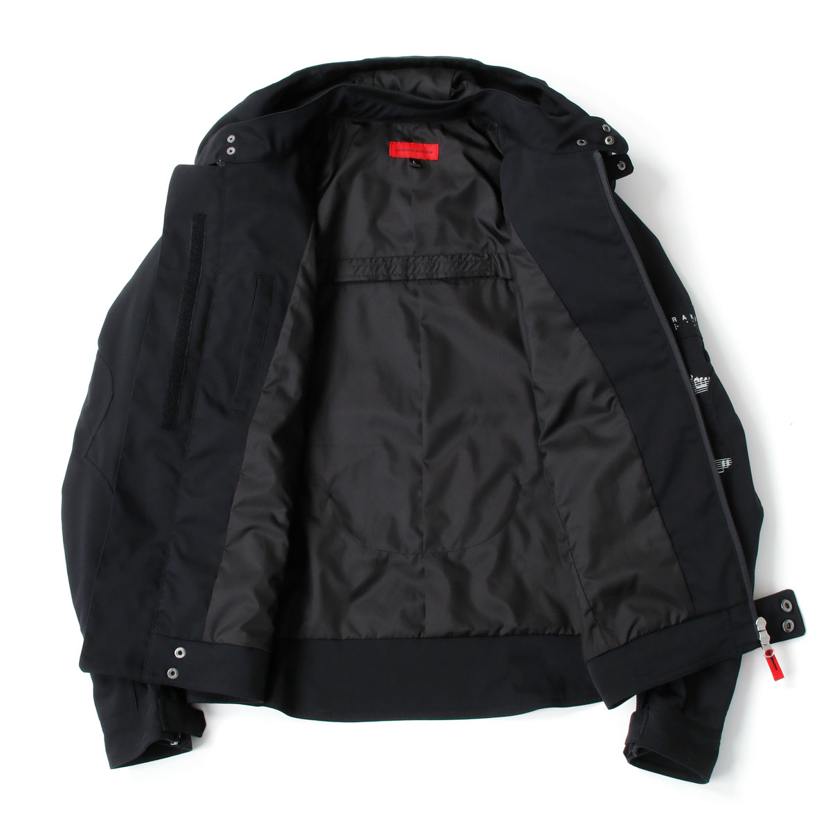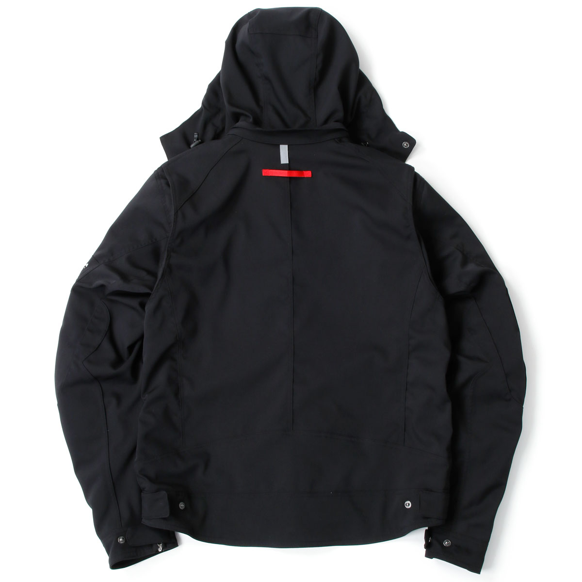 定番アイテムとして企画されたシンプルなデザインのブルゾンです。 脱着式のフードの前後がヘルメットの中に収まるので、首元への風の侵入を防ぎます。