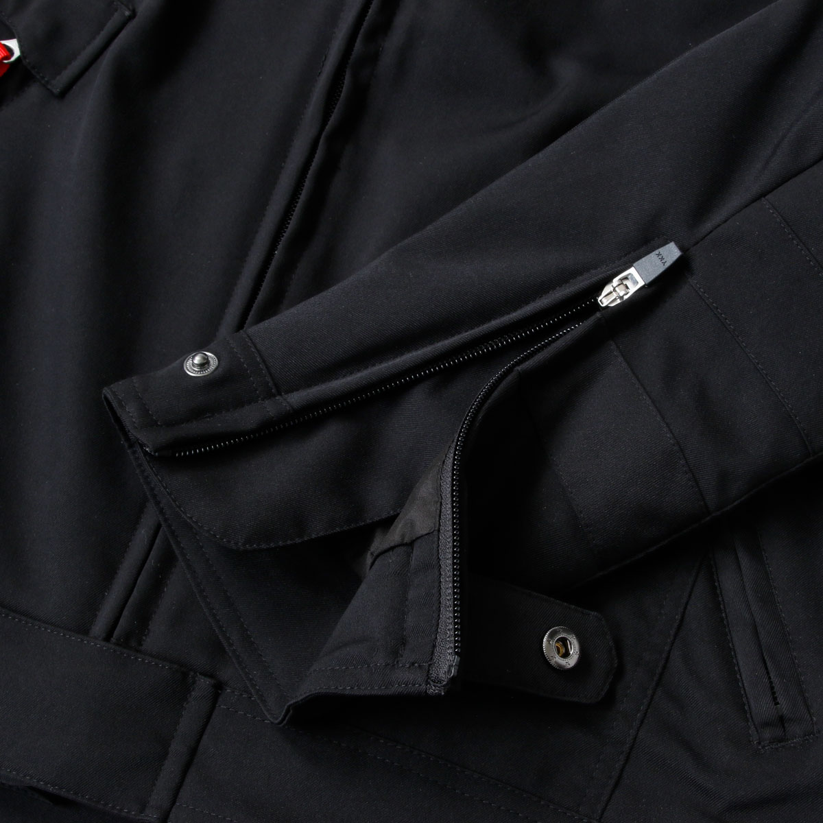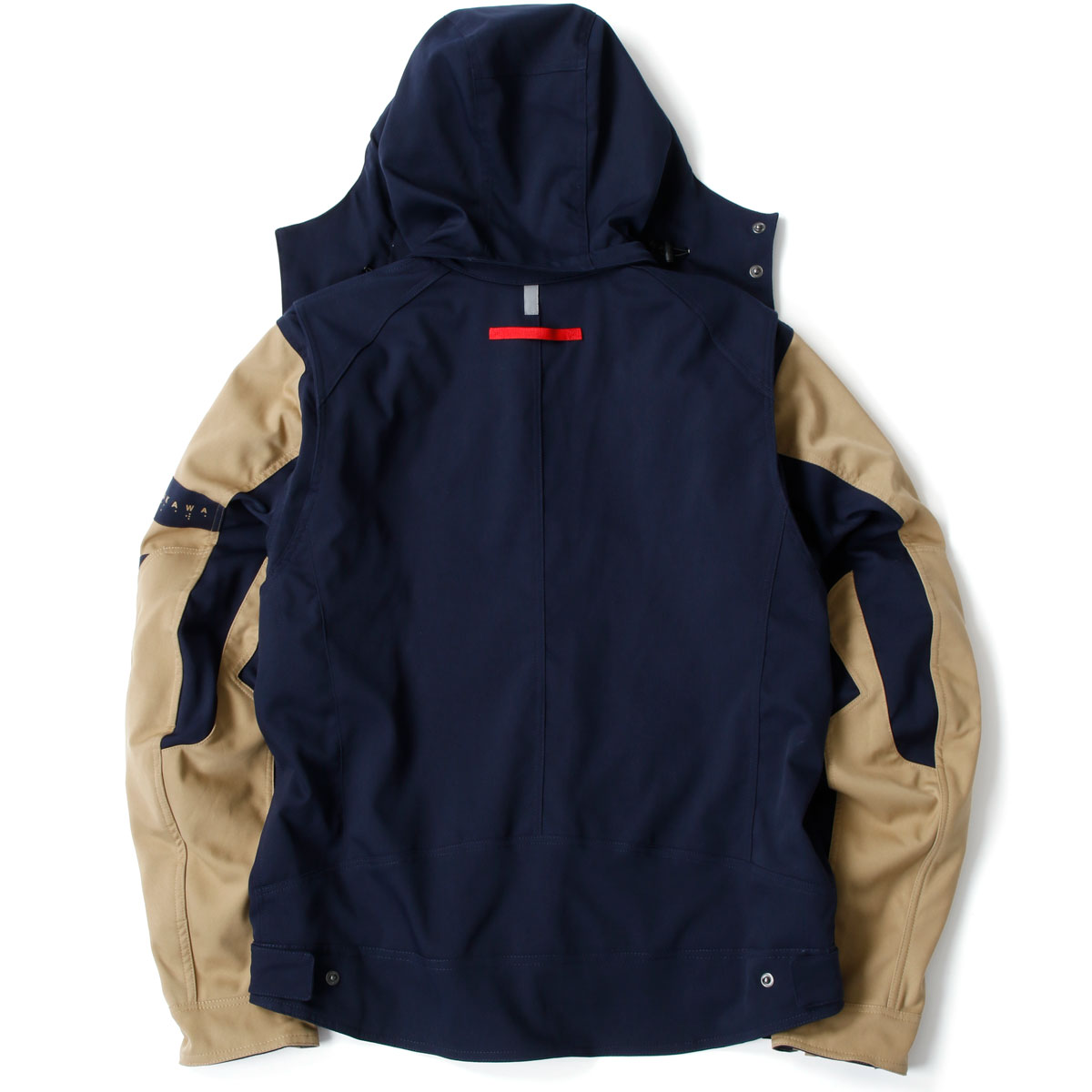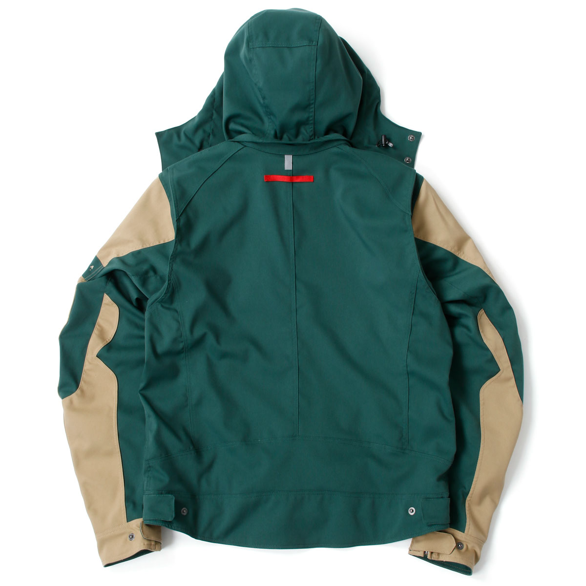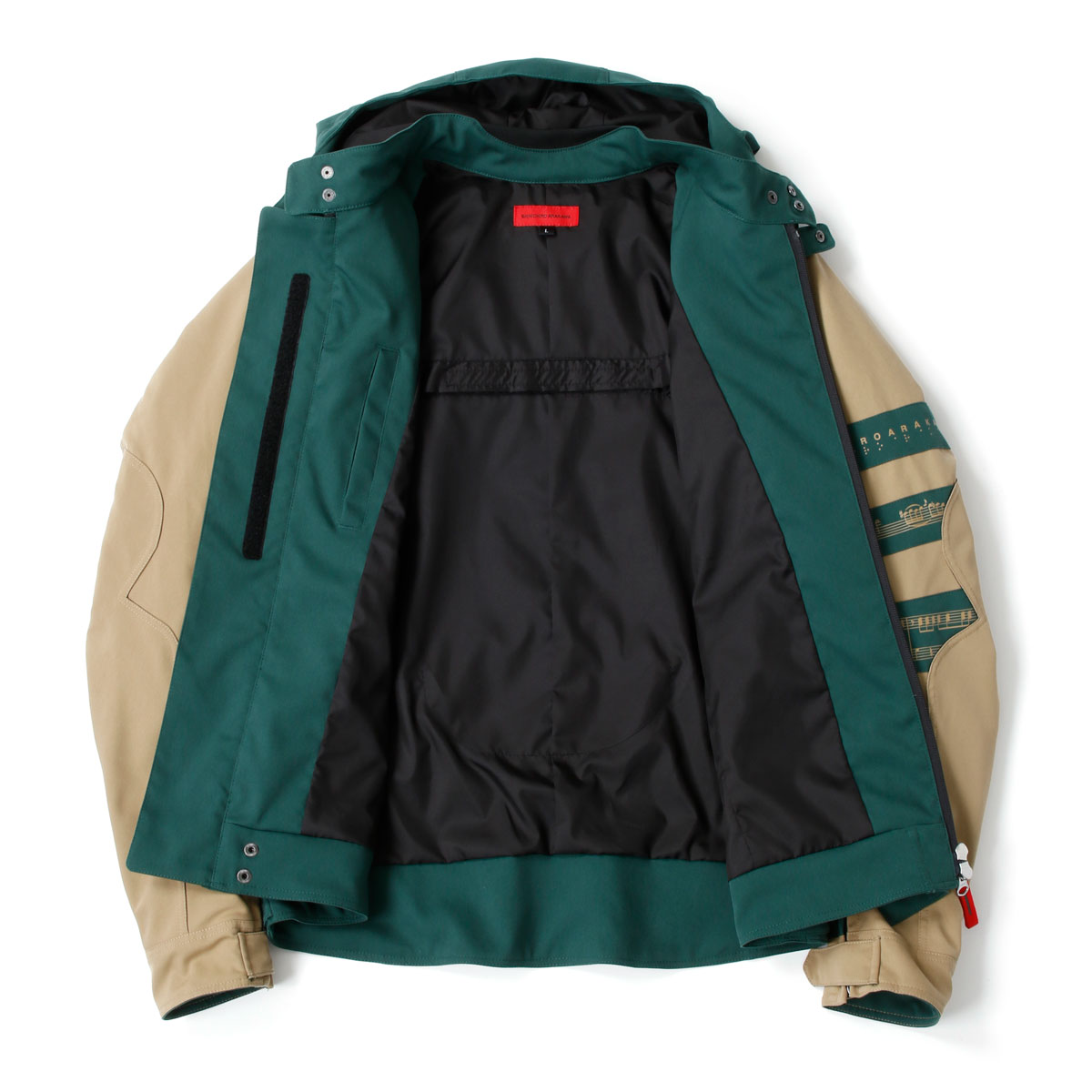 定番アイテムとして企画されたシンプルなデザインのブルゾンです。 脱着式のフードの前後がヘルメットの中に収まるので、首元への風の侵入を防ぎます。