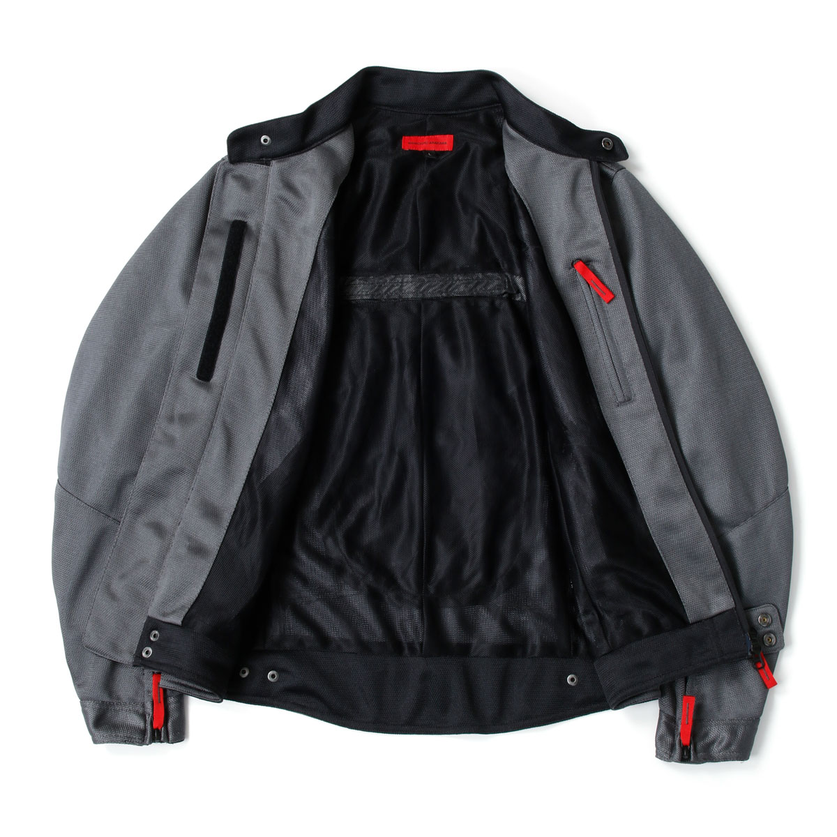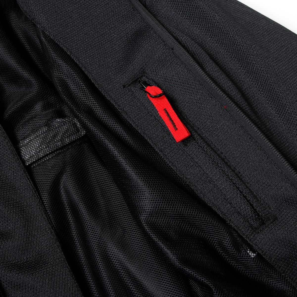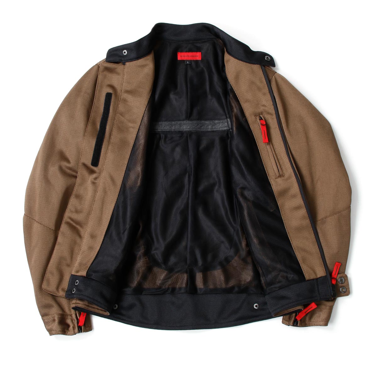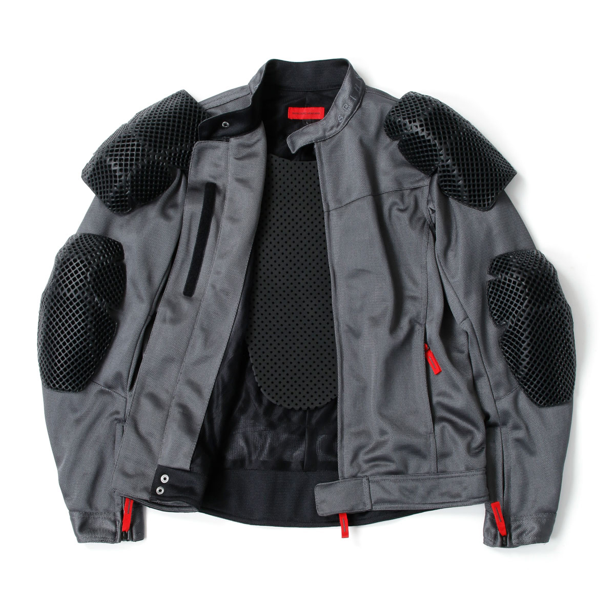肩、肘、背中には標準で簡易的なプロテクターが付属。オプションで胸部プロテクター装着可能なベルクロが装備されています。