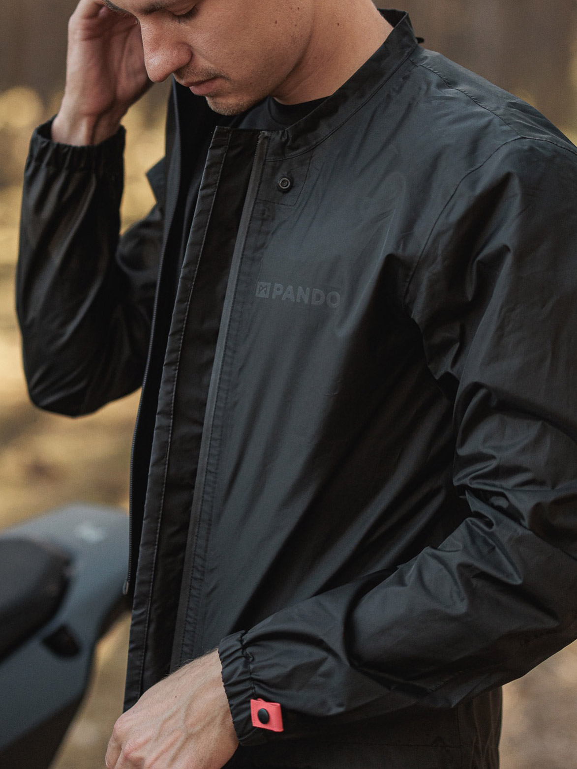 防水YKKジッパー付きのフロントポケットには、小物などを収納可能。袖口には「Pando」の反射プリントが施されており、夜間の視認性も向上させています。