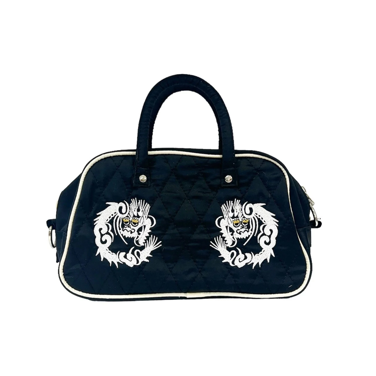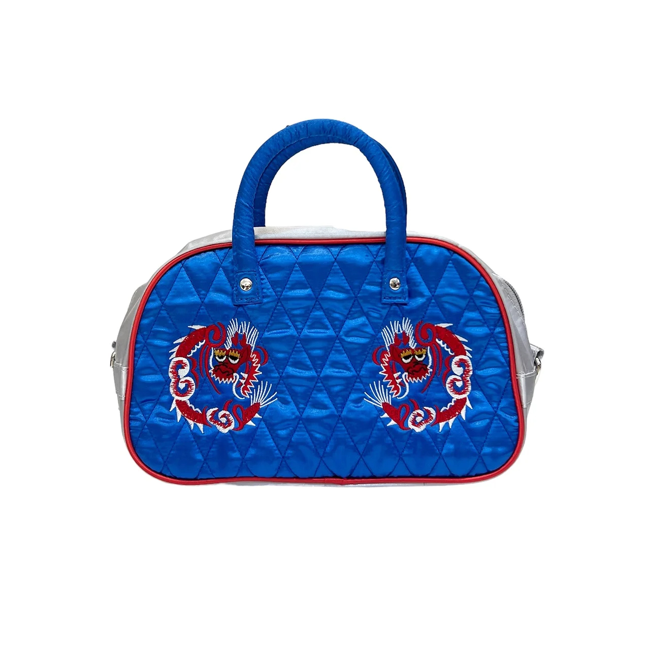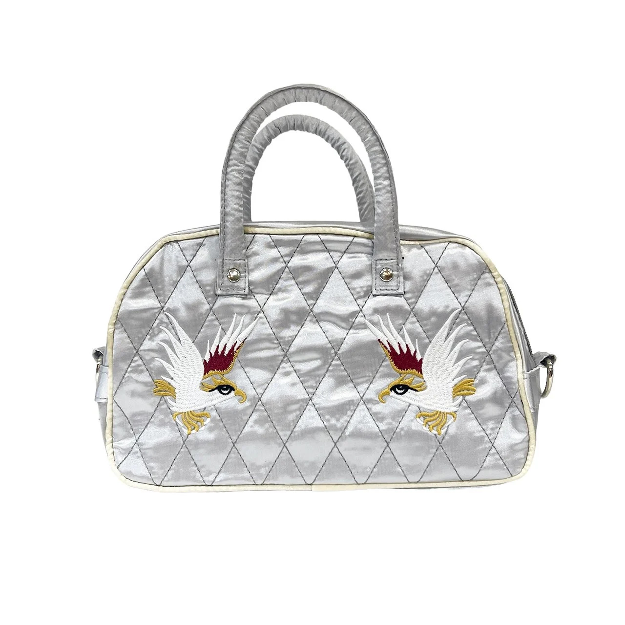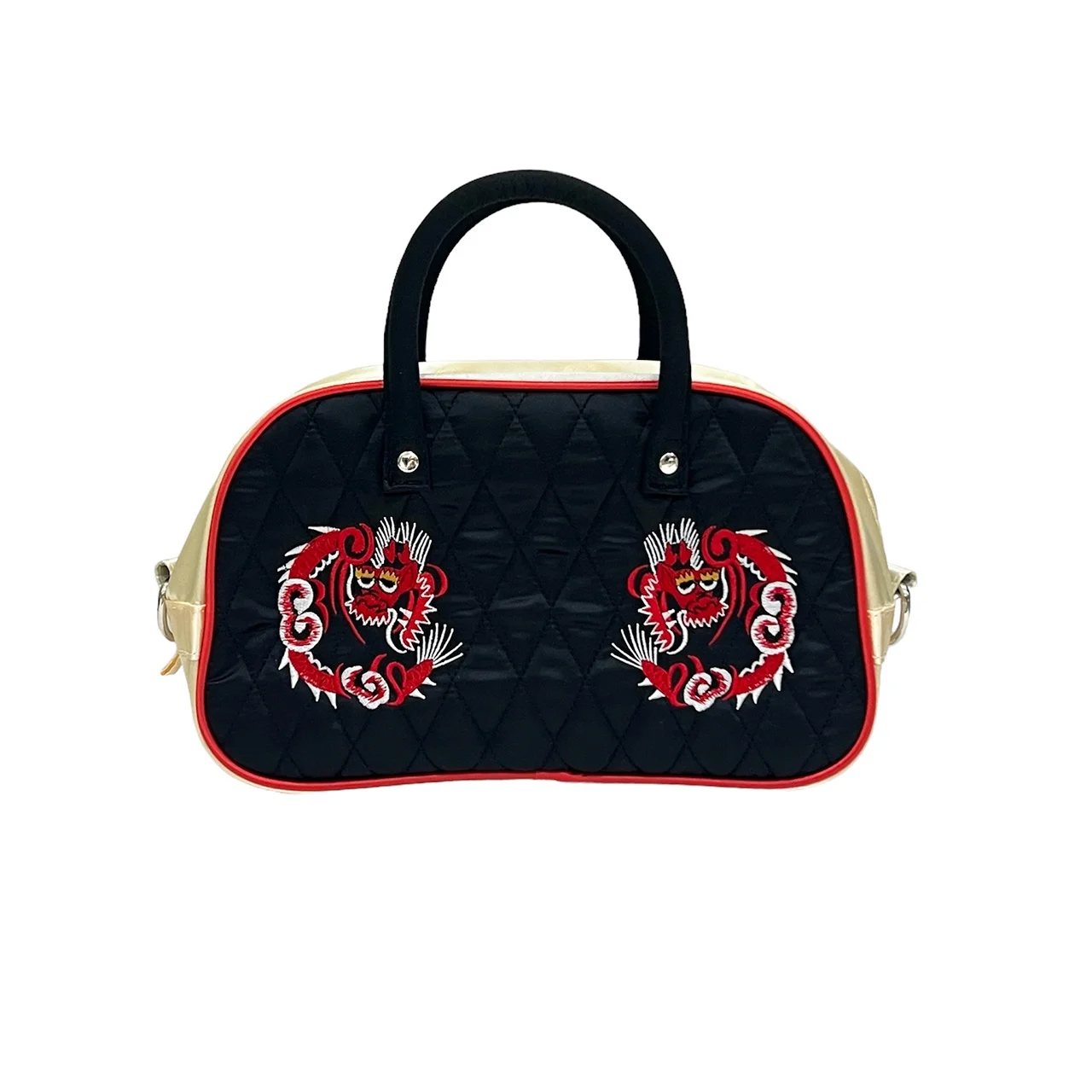 スカジャンで用いられているサテン生地、配色に、クラシックなデザインの刺繍を落とし込んだ、ユニークなミニボストンです。