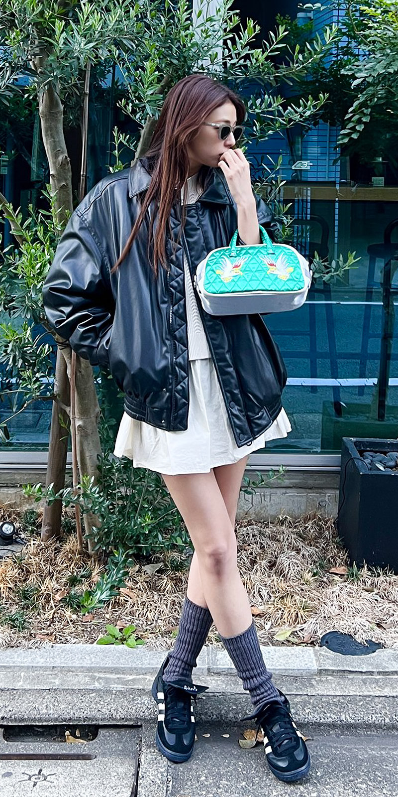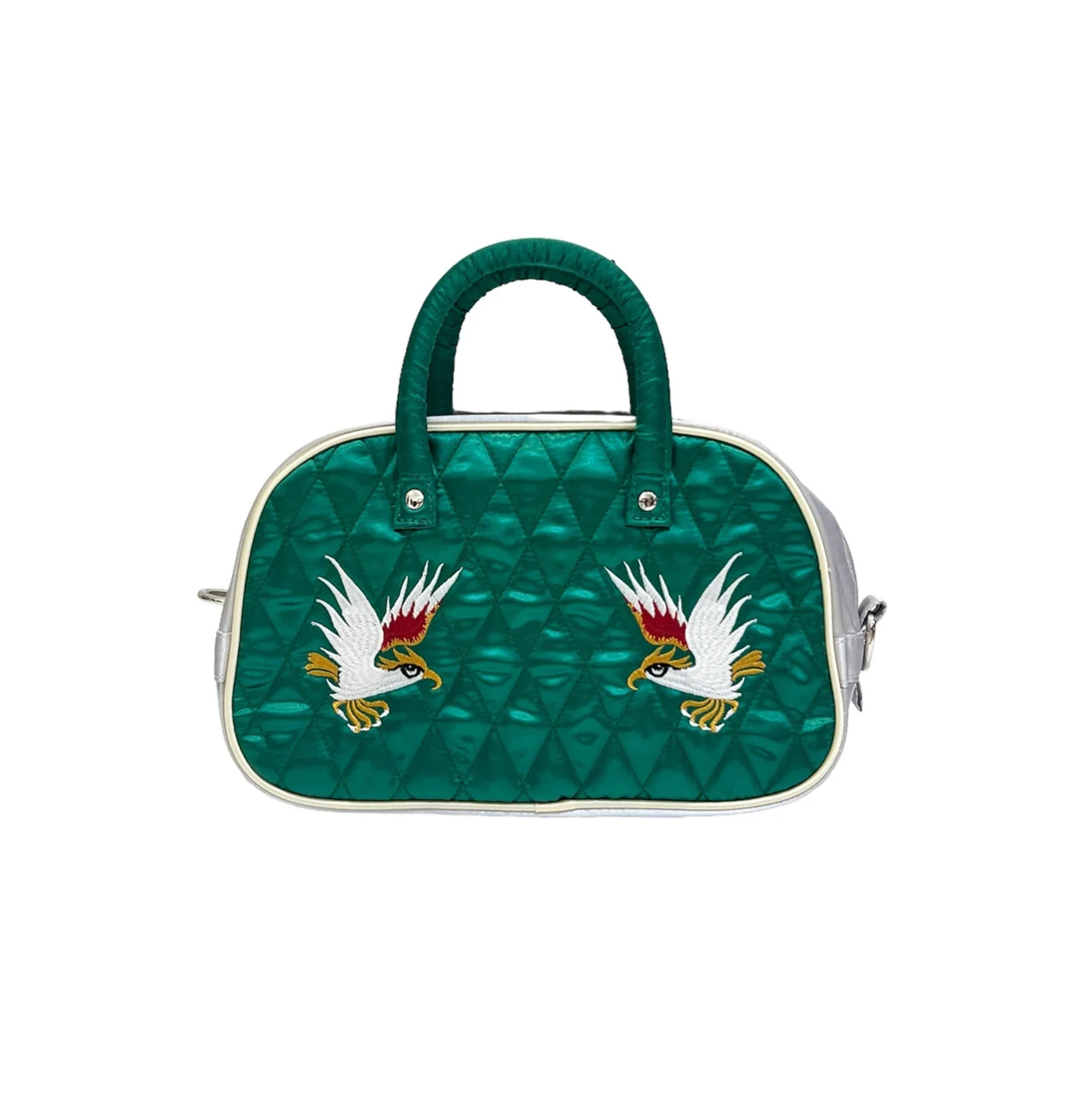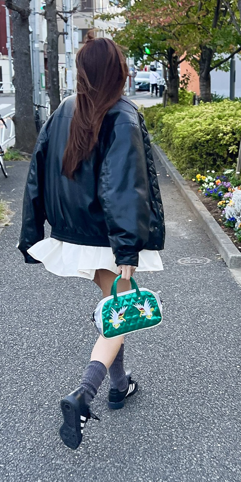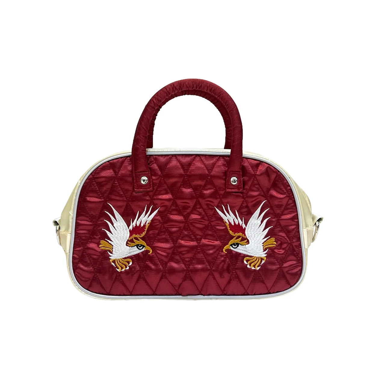 スカジャンで用いられているサテン生地、配色に、クラシックなデザインの刺繍を落とし込んだ、ユニークなミニボストンです。