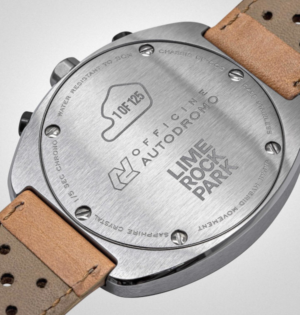文字盤の外側に表示されたタキメーターは、ライム ロック パーク サーキットのラップタイムに応じた平均速度が瞬時に判断できるように予め設定されており(周回ラップは45秒から1分15秒を想定)、ケースバック(裏蓋)には、シリアルナンバーと、アウトドローモ、ライム ロック パークのロゴがそれぞれ刻印されています。また、サーキットのしきたりとして、18時以降にエンジンを始動させてはいけないという決まりごとがあるため、24時間積算計の18の文字があえて赤く記されています。