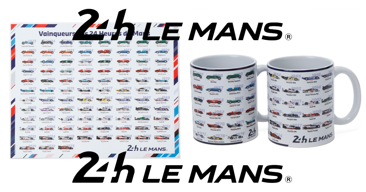 ウィナーマシンが毎年誕生するごとにアップデートされてきたウィナー マグカップは、今回より2個セットとなって登場。1つにマグカップに収まらなくなってしまった分、マシンのイラストが大きくなり、わかりやすくなりました。そのほか、映画「栄光のル・マン」をモチーフにしたガルフカラーのポルシェ917のマグカップや、2023年までのル・マン歴代ウィナーマシンのイラストをラミネートしたデスクマットが入荷。デスクマットですが、両面テープで壁などに貼り付けたり、額装に入れてポスターとしてご使用いただくことも可能です。
