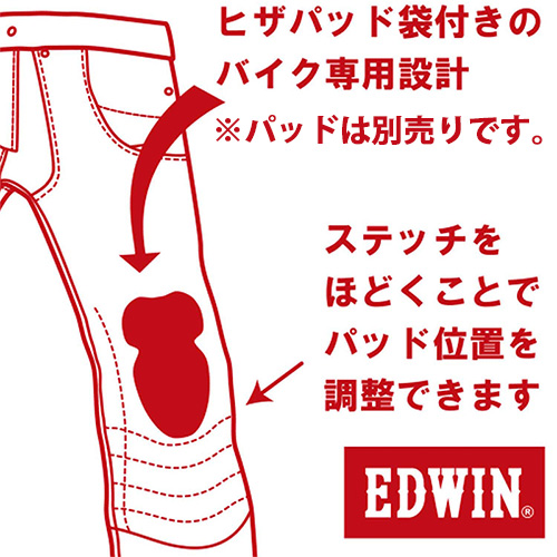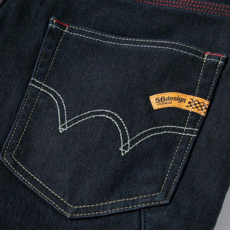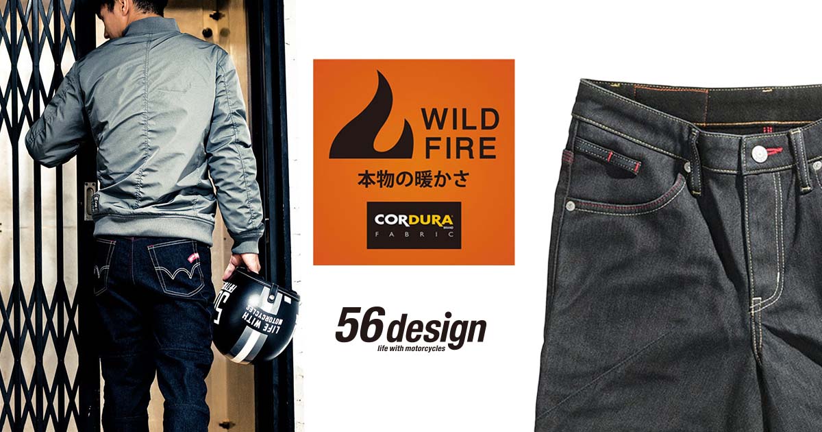 「56design×EDWINのコラボジーンズ、WILD FIREウィンターモデルは、寒さに対応しながらシルエットにもこだわったデザインです。EDWINの高性能素材と耐久性のあるコーデュラ® デニムを組み合わせ、ライディングに最適なジーンズ生地として誕生しました。