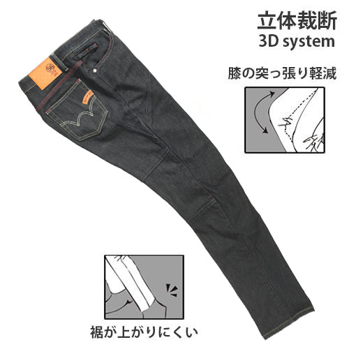 低頭リベットと立体裁断を採用し、ライディングポジションでも快適に履ける設計。裾が上がりにくく、膝の動きもスムーズです。