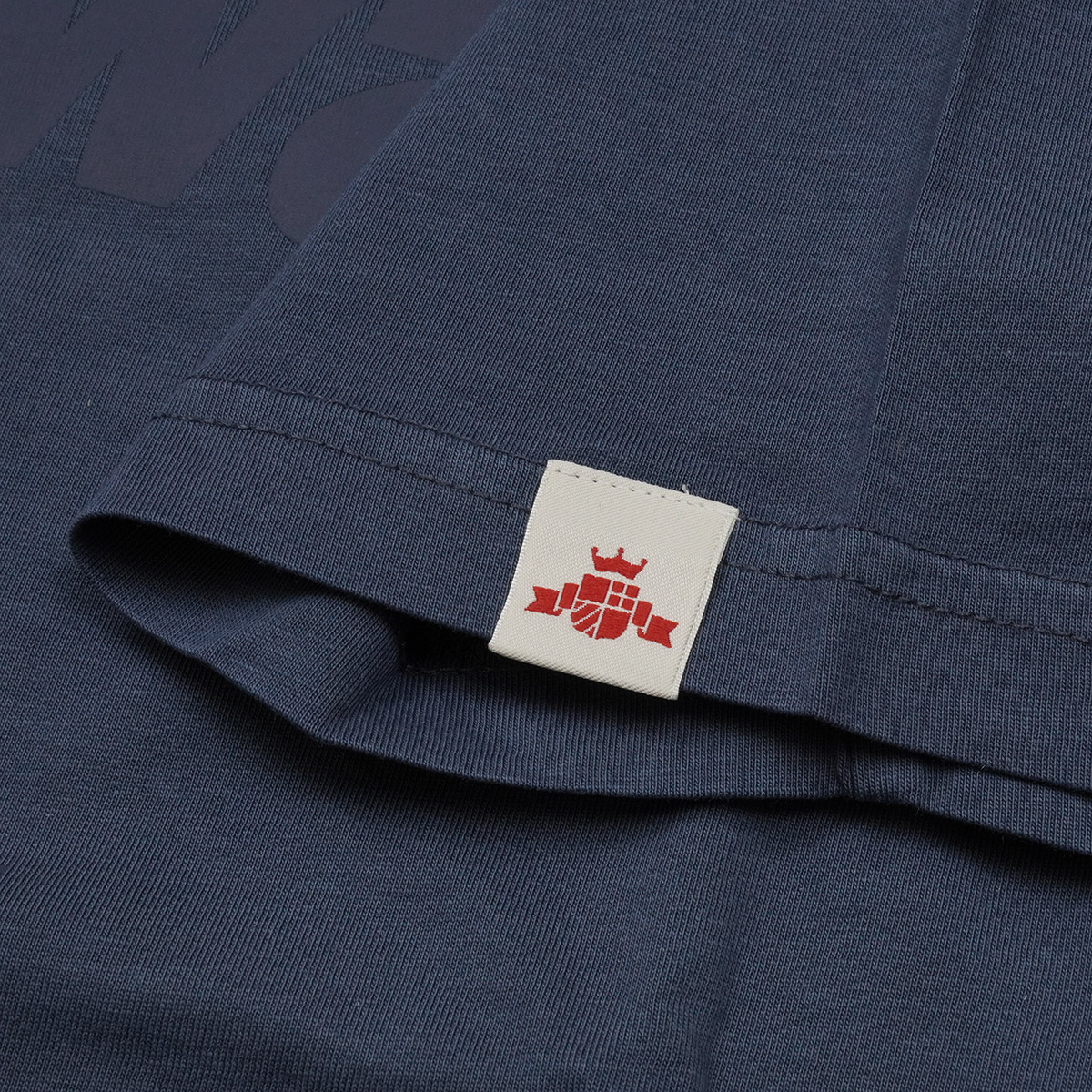 一見するとシンプルなプリントTシャツですが、3色のうちブラック/ミディアムブルーは生地とほぼ同じ色でブリントされており、光の加減でそのデザインシルエットが映し出される、遊びの効いた仕上がりに。また今回ご紹介しているすべてのTシャツに、エンブレムが刺繍された織ネームがアクセントとして左袖に飾られています。※モデルによりカラーは異なります