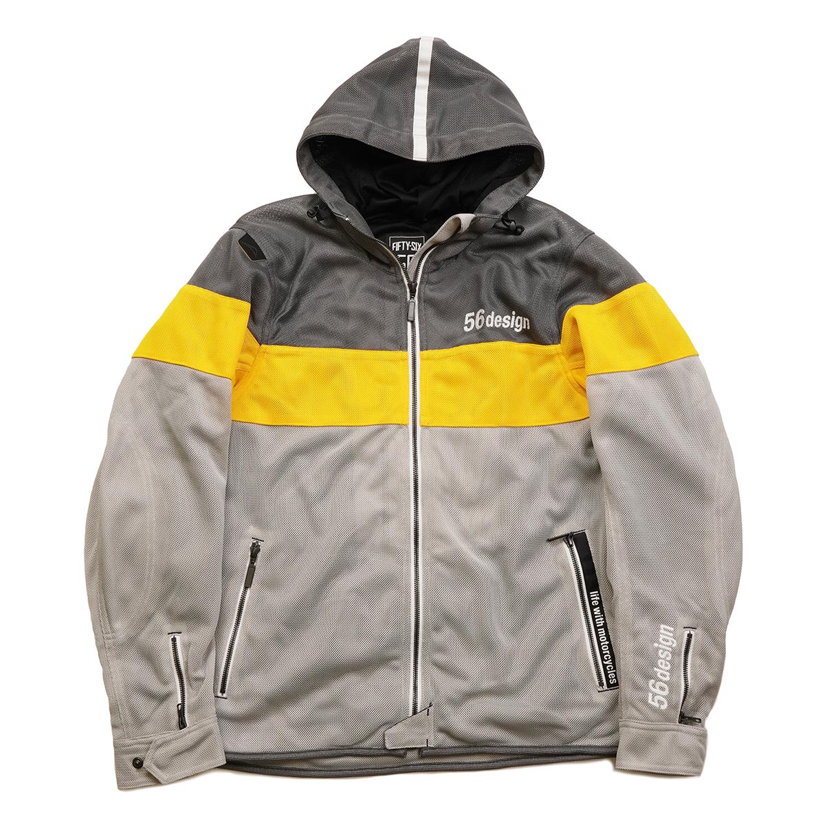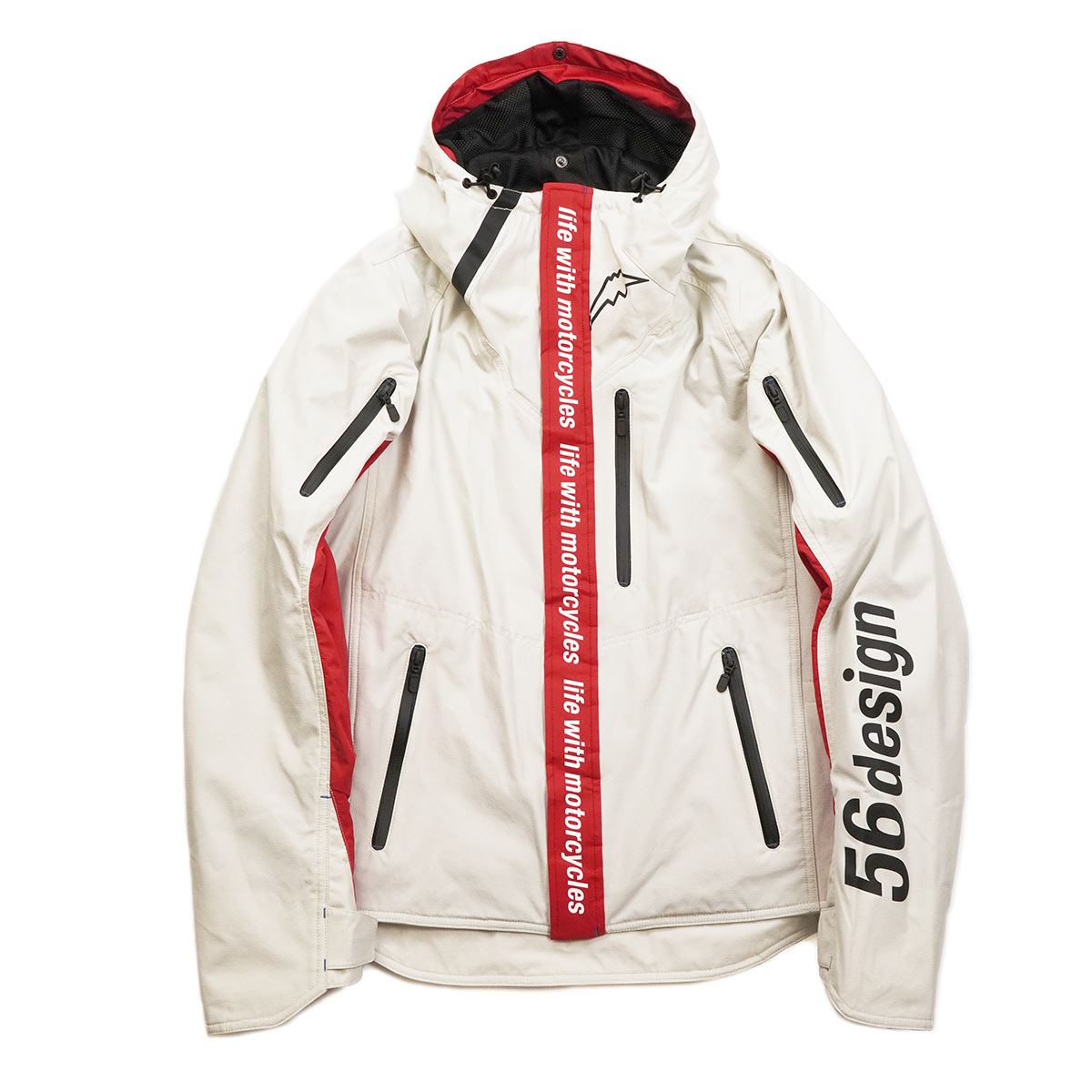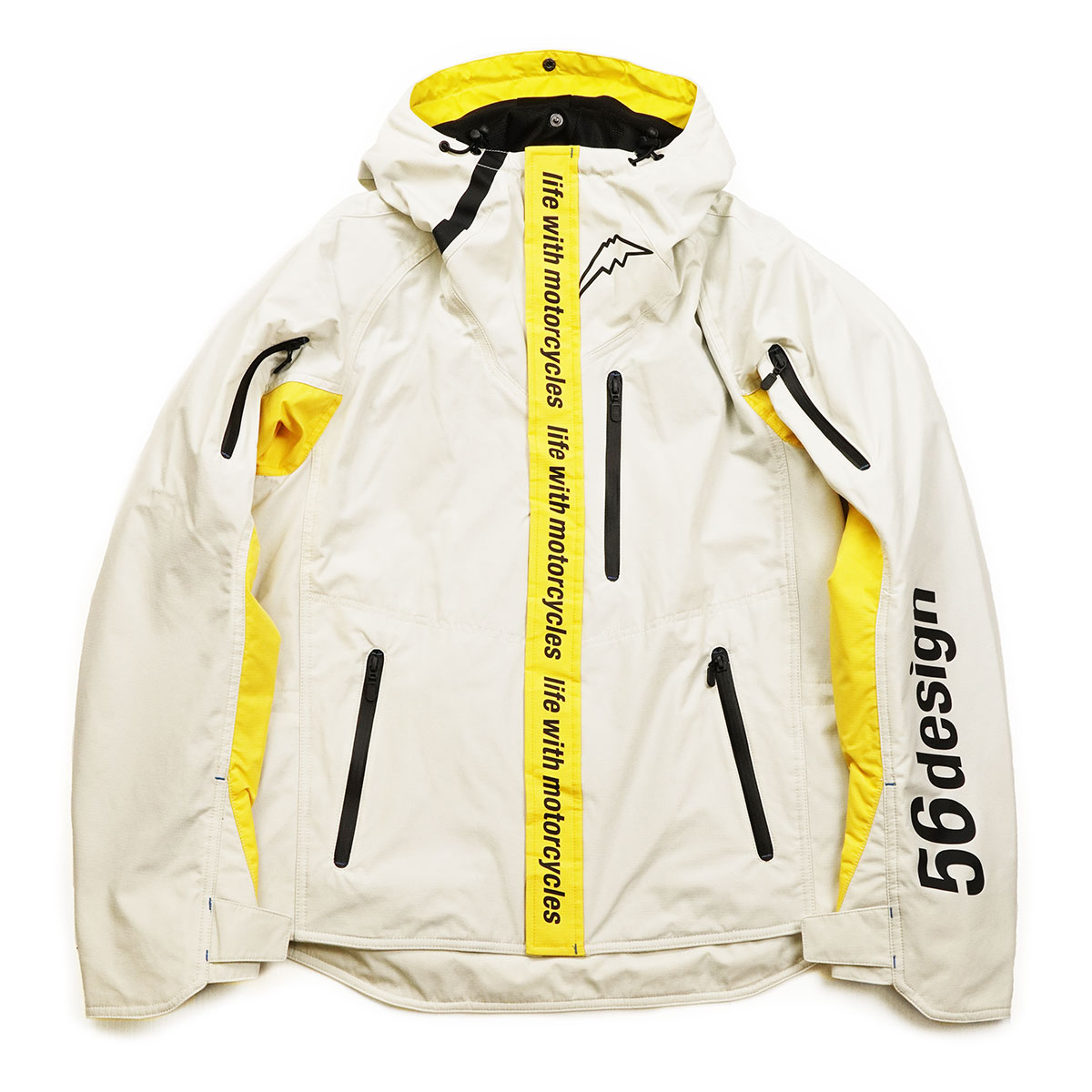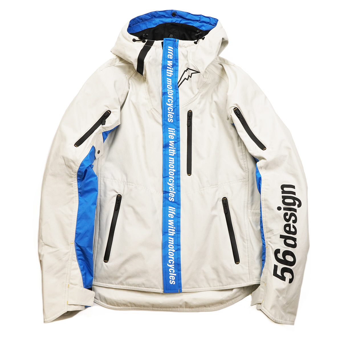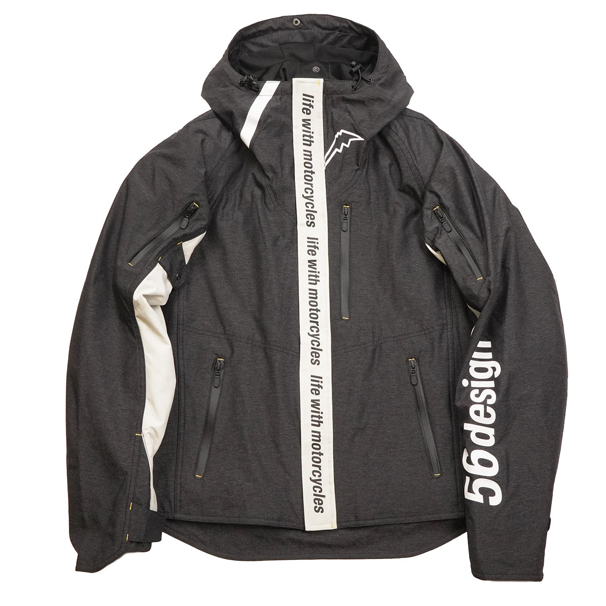 左のポケットには56designのアイデンティティがプリントされたデザインテープ。右の肩にはKUSHITANIのロゴ入りパッチがつく非対称デザイン。フィフティーシックスデザイン特有の感性がきらりと光ります。