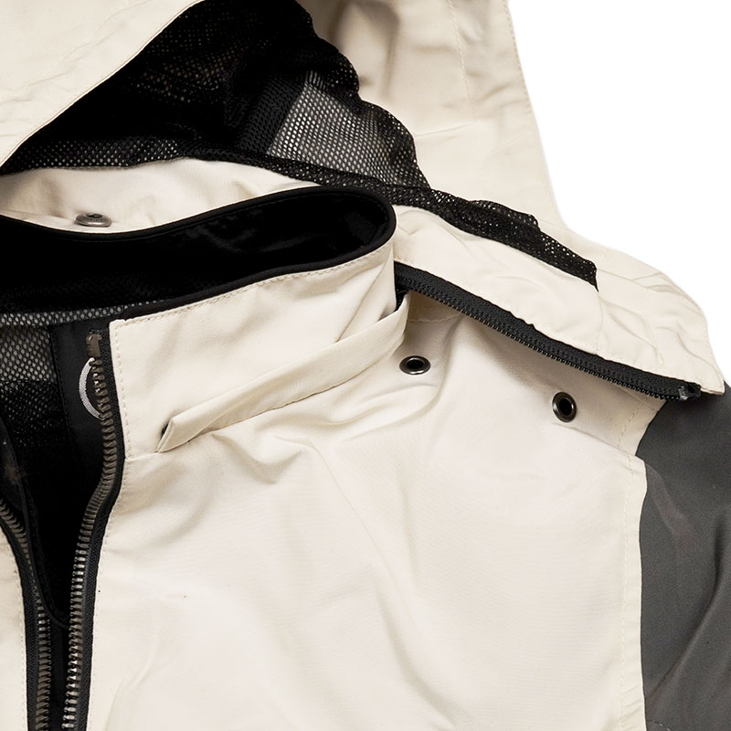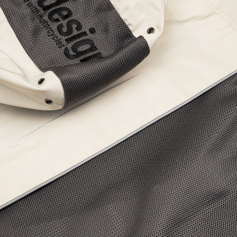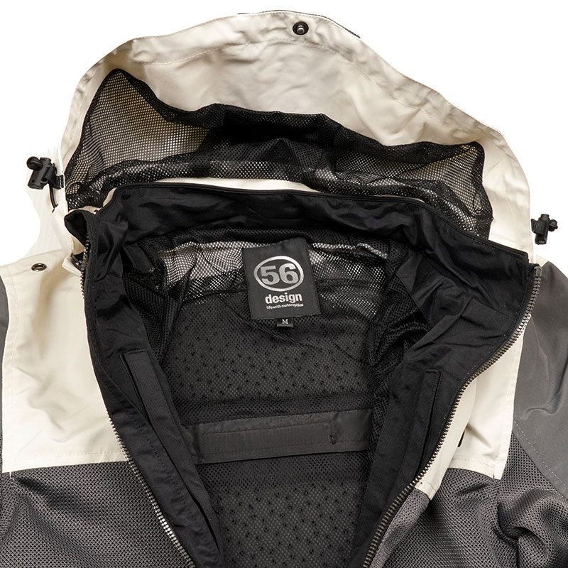 昨年のモデルとは異なり、使用する生地から見直され、より快適なアイテムにアップデートされています。また旧モデルではボディカラーが同一で、フード部分のカラーリングアレンジのみの商品となっておりましたが、今回は3色のカラーパターンが新登場。カラーは『ブラック/ホワイト』『グレー/レッド』『アイボリー/ネイビー』の3色で、ツーリングシーズンの新緑にもよく映えるカラーリングとなっています。