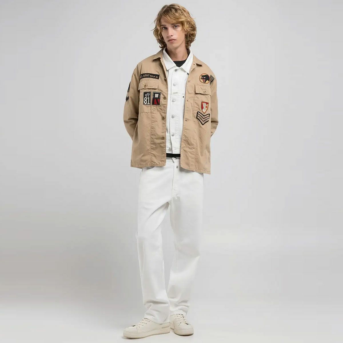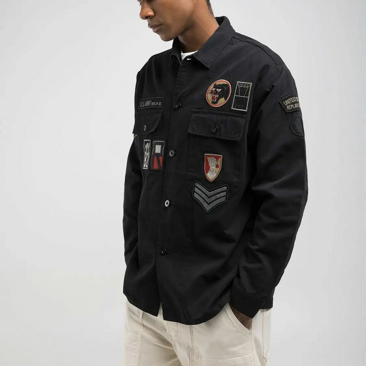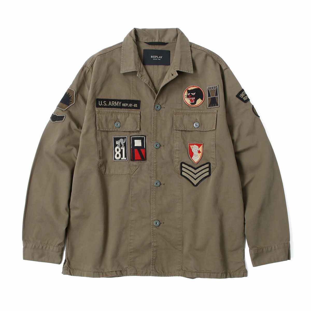 複数の刺繍によるワッペンがあしらわれた、贅沢なミリタリーシャツジャケット。モデルカットのようにクリーンな着こなしから、デニムなどに合わせてヘビーデューティーなスタイリングも可能です。