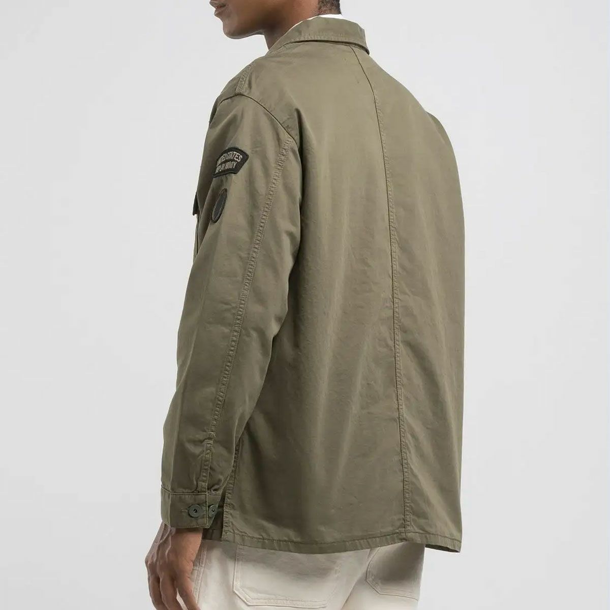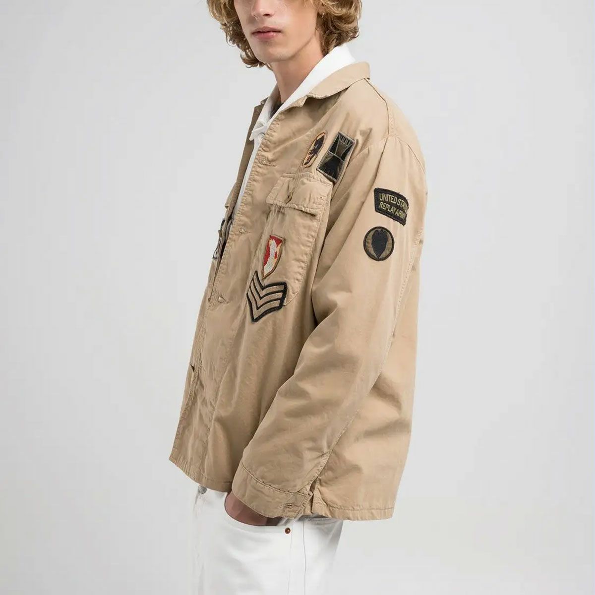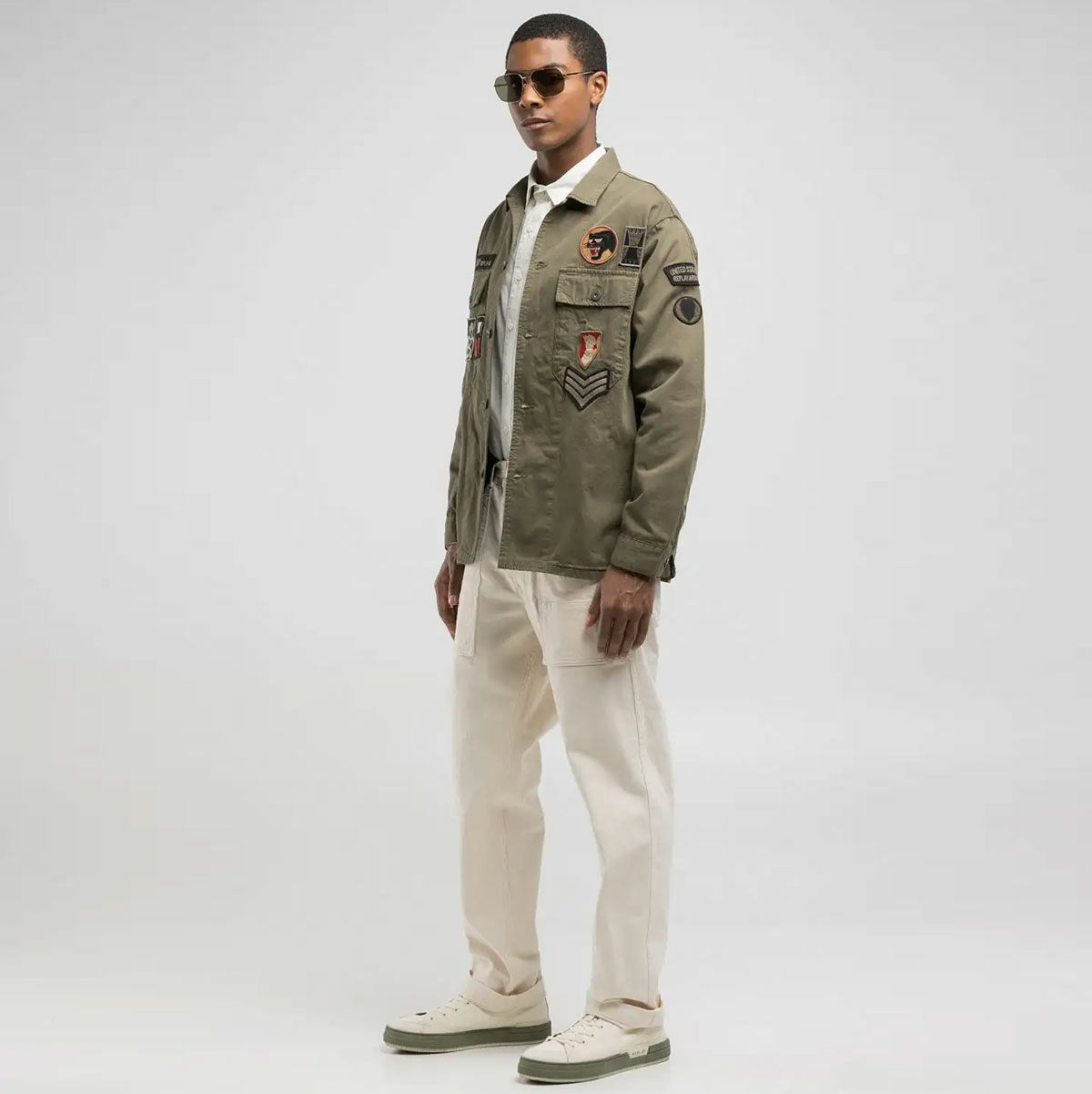 複数の刺繍によるワッペンがあしらわれた、贅沢なミリタリーシャツジャケット。モデルカットのようにクリーンな着こなしから、デニムなどに合わせてヘビーデューティーなスタイリングも可能です。